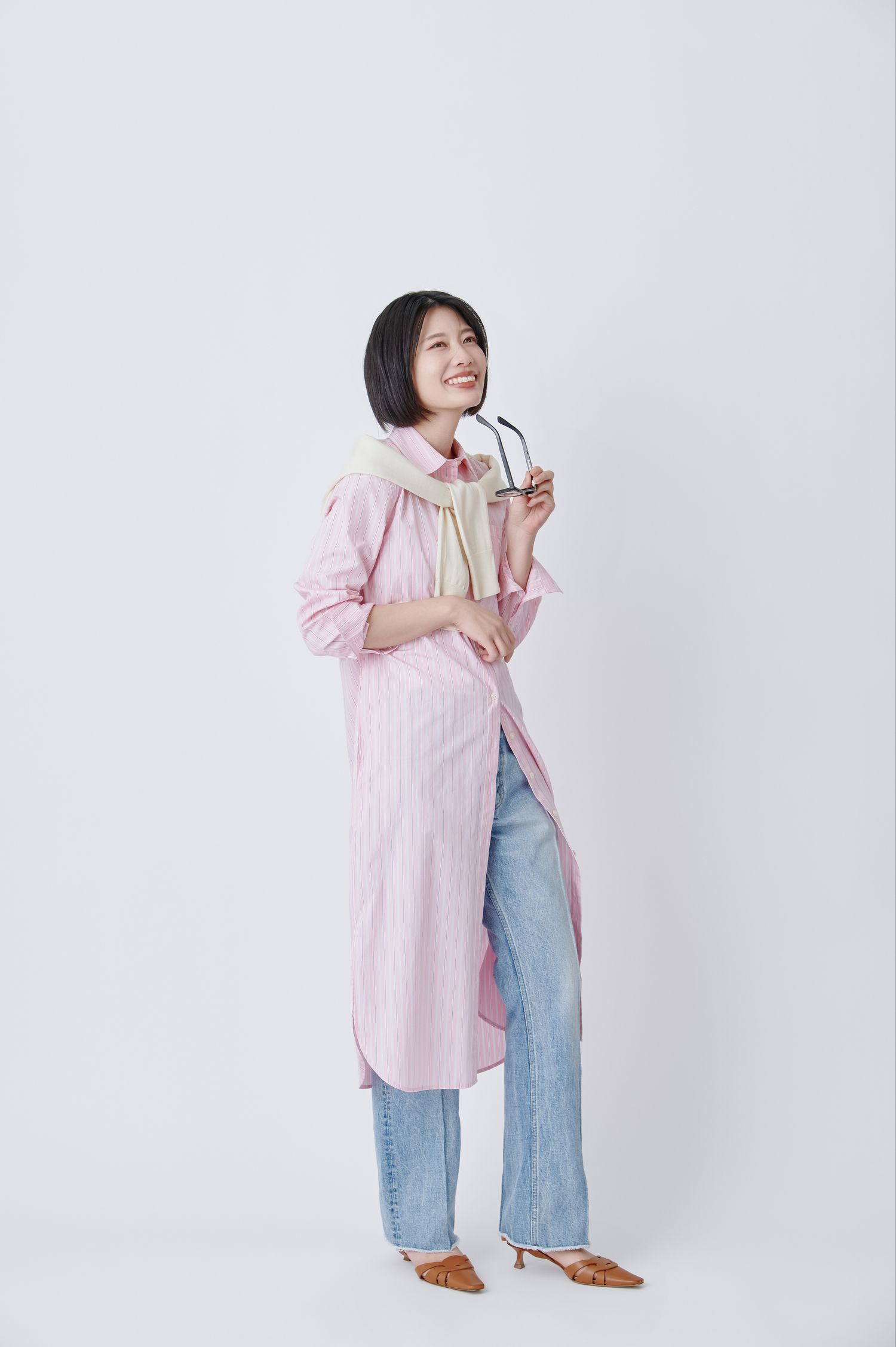 ピンクのストライプシャツワンピースにライトブルーのデニムを合わせた、春らしい配色のカジュアルコーデ。淡色同士の組み合わせが、軽やかで爽やかなムードを演出します。春の寒暖差対策に重宝するニットは肩掛けして、こなれ感をプラス。足元はブラウンのレザーシューズで引き締めて、パステルカラーコーデのぼやけを回避。