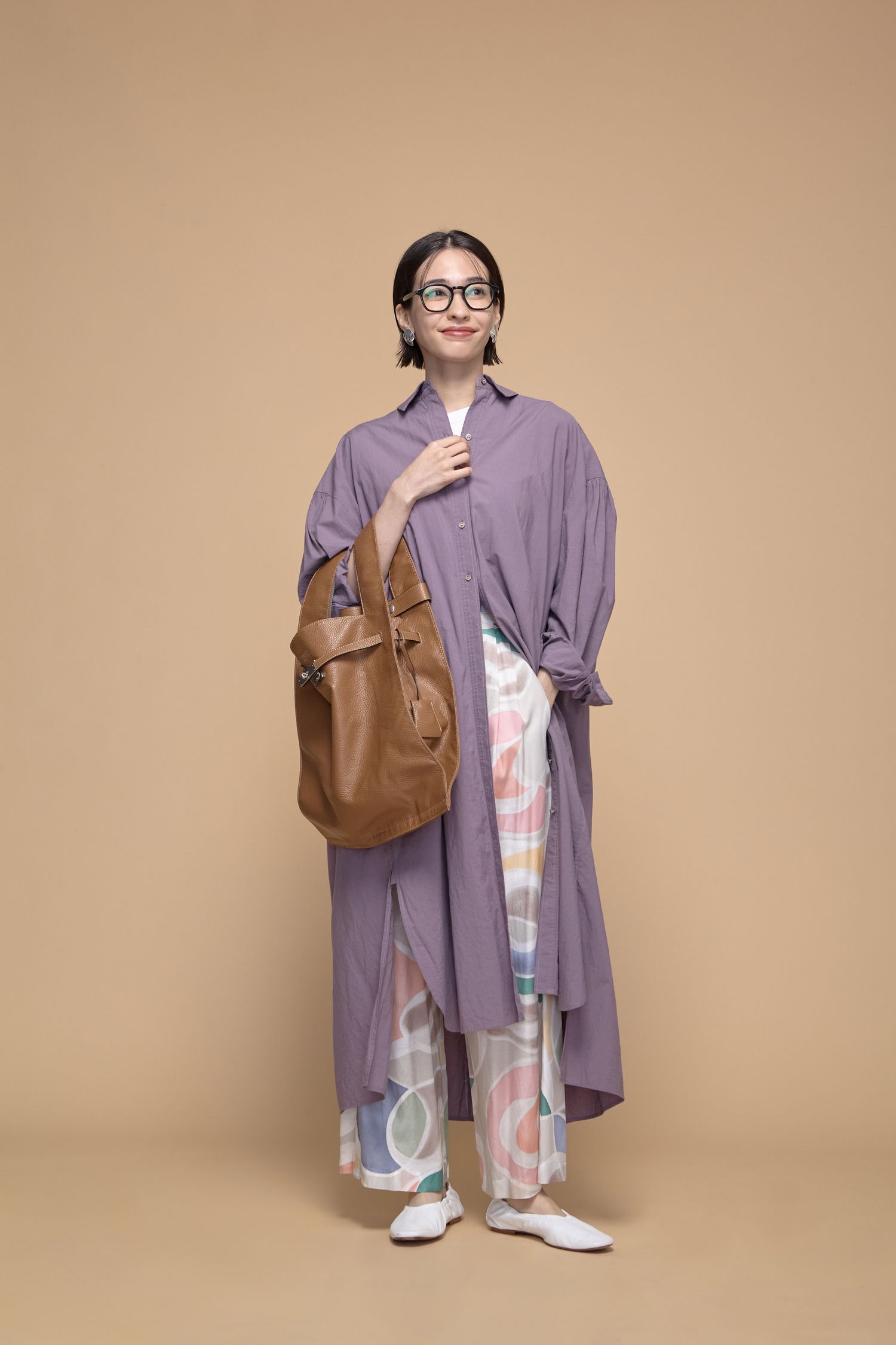 パープルのシャツワンピースに柄パンツを合わせた、遊び心のあるレイヤードコーデ。シャツワンピースはアウター感覚でさらりと羽織ることで、リラクシーな印象に。手元にはブラウンのレザーバッグを合わせ、カラーアイテムを組み合わせた華やかなスタイリングにほどよい落ち着きを。