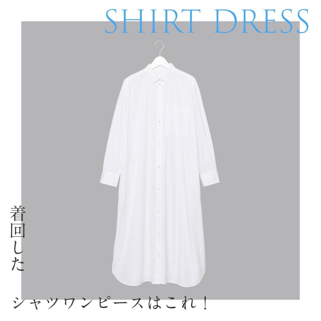 最初に着回すのは、ヒューマンウーマン(human woman)のシャツワンピース。ほんのり透け感のあるコットン素材で仕立てられた、クリーンな1着です。無地のホワイトでシンプルなデザインだからこそ、幅広い着こなしを楽しめます。
