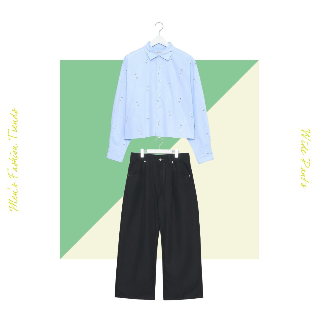 ジエダ(JIEDA)のワイドパンツは、落ち感のあるストレートシルエットで、程よいボリューム感がありながらもすっきりとした印象に仕上げてくれます。トップスには、ワイドパンツと好相性の同ブランドの短丈の軽やかなブルーのシャツを合わせて、爽やかさをプラス。さりげないフラワー柄と、裾の断ち切りデザインがアクセントになり、シンプルな組み合わせでも個性が光るスタイルに仕上がります。