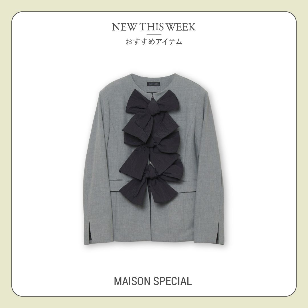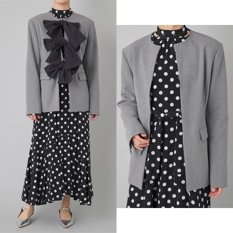 最初にご紹介するのは、大ぶりのリボンが目を引くメゾンスペシャル(MAISON SPECIAL)のノーカラージャケット。グレー×ブラックの大胆な配色が、甘くなりがちなリボンディテールをモードな印象に引き上げてくれます。
