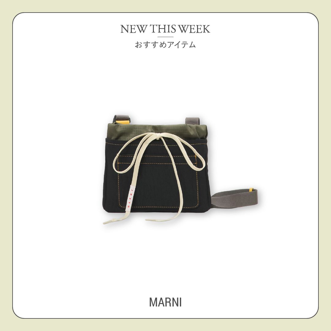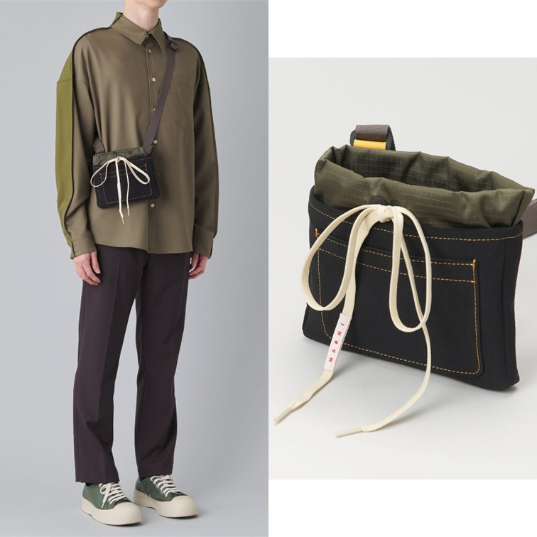 メンズからはマルニ(MARNI)のミニバッグをピックアップ。ブラックのナイロン素材にカーキのライナーやイエローのレザートリムを組み合わせた、プレイフルな配色が魅力です。
