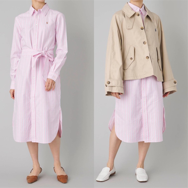 共布のウエストベルトをキュッと絞って1枚で着こなすのはもちろん、デニムパンツをレイヤードしたり、軽い羽織りとして取り入れたりと幅広い着こなしを楽しめる1着。優しいピンクのストライプが、春らしい華やかなムードを演出します。