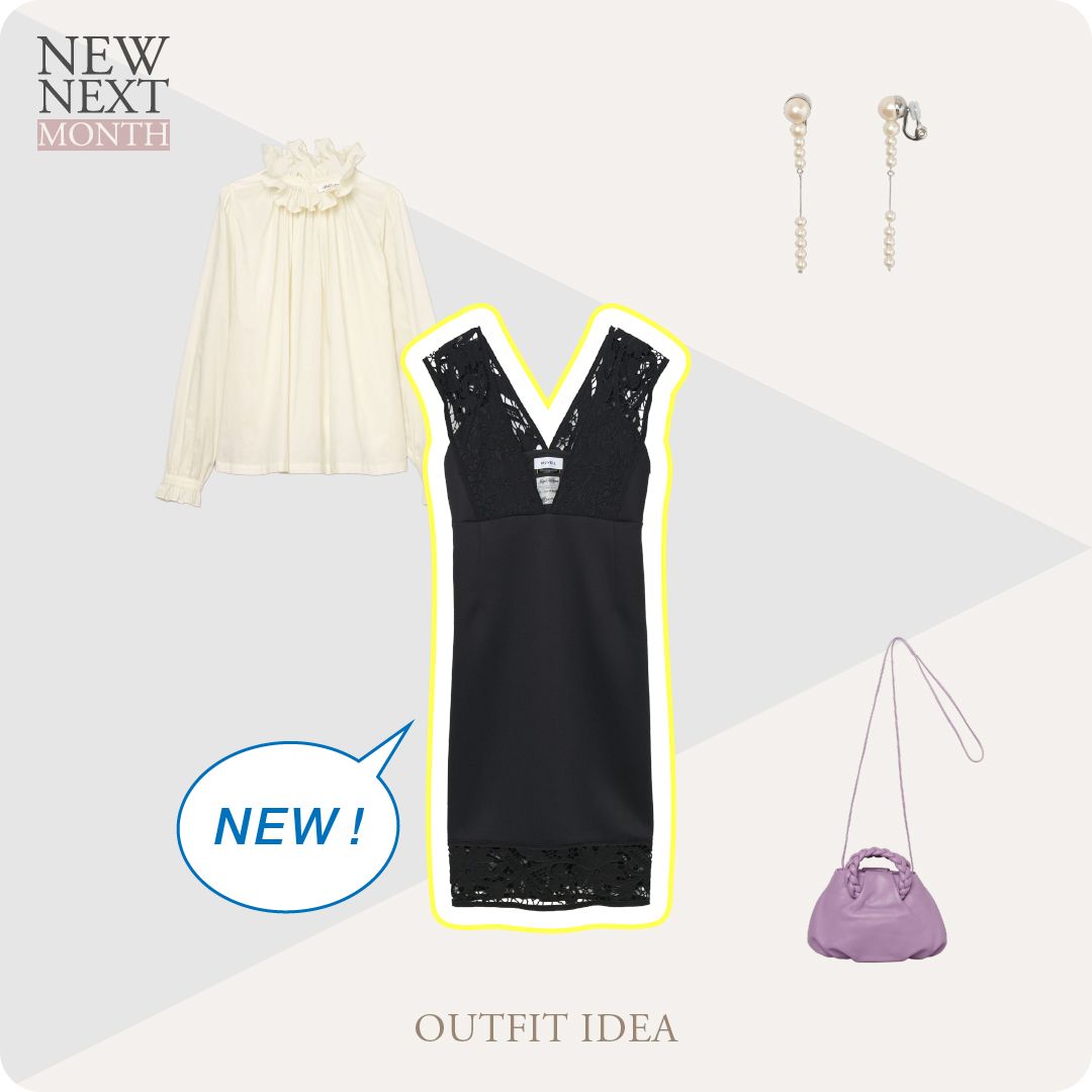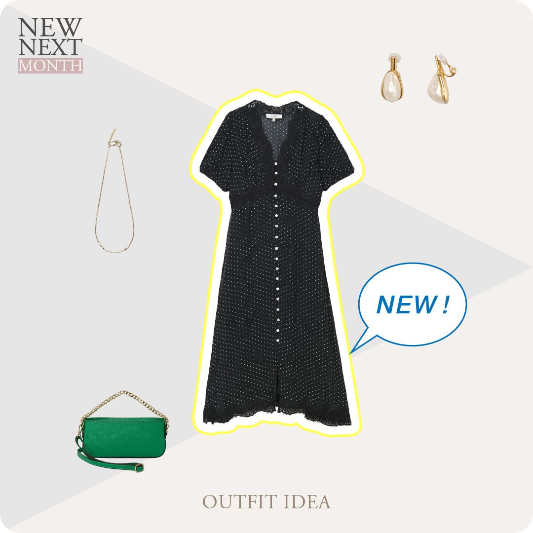 今季トレンドの“ドット柄”のワンピースを使用した、春のお出かけコーデ。シーニューヨーク(Sea New York)のドット柄ワンピースは、ブラックベースで甘さを抑えたデザインなので、ドット柄に慣れていない方でも取り入れやすい1着。すっきりとしたシルエットとレースディテールが、女性らしさを引き立てながらも上品な印象に導いてくれます。