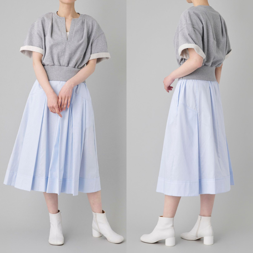 やわらかなブルーのスカートが春夏らしい軽やかさを演出。合わせるシューズやバッグ、アクセサリー次第でカジュアルにもきれいめにも合わせられる汎用性の高さもポイントです。アナザーアドレスでは、やわらかいベージュカラーのドッキングワンピースも同時に展開中。ぜひ、あわせてチェックしてみてください。