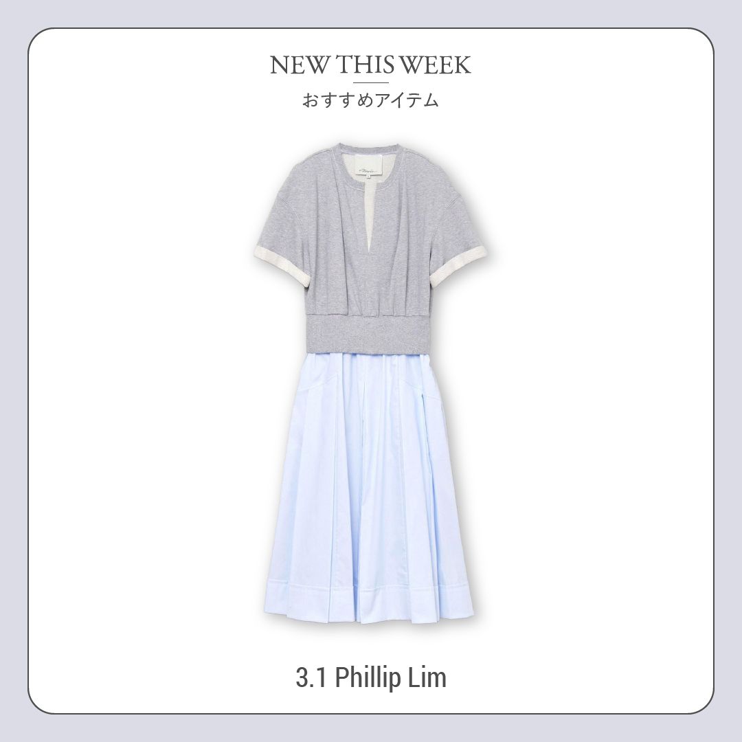 最初にご紹介するのは、裏毛仕様の半袖トップスに軽やかな布帛スカートをドッキングした3.1 フィリップ リム(3.1 Phillip Lim)のワンピース。トップスとスカートの切り替え位置が高めに設定されているので、自然とスタイルアップが叶います。