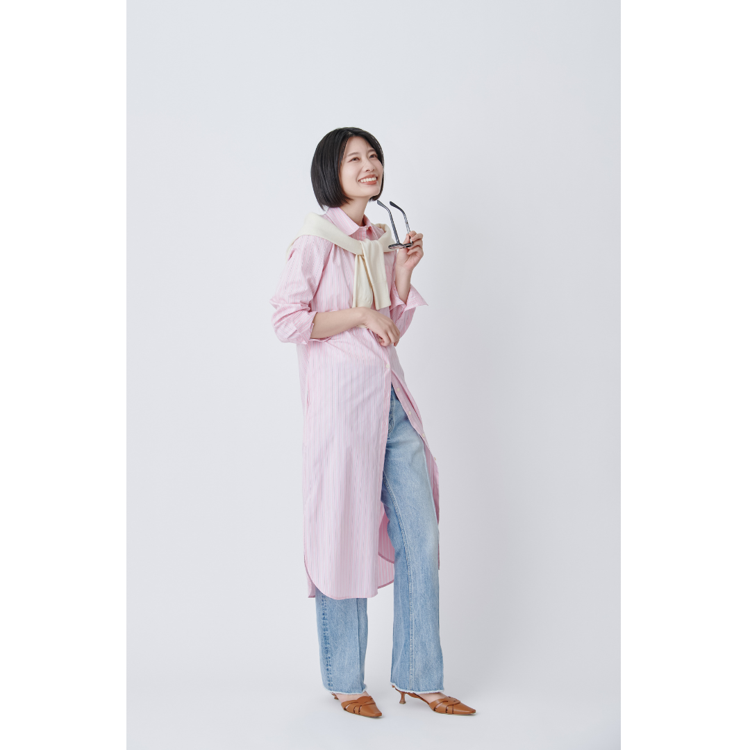 やわらかなピンクのストライプシャツワンピースを主役に、ライトブルーのデニムを合わせた軽やかなスタイル。肩にさらりと掛けたベージュのニットが、コーデ全体にやさしい抜け感をプラスしつつ、気温差のある春の日にもしっかり対応。動きやすさとこなれ感を両立しながら、桜風景に自然と溶け込むお花見コーデです。