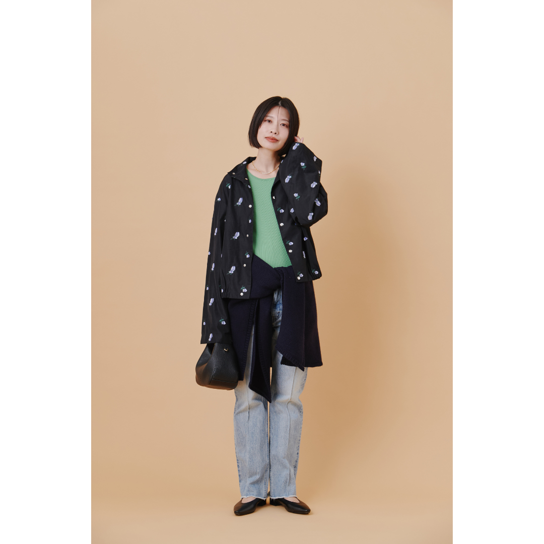 彼とまったりおしゃれなカフェでランチ――そんな日は、肩の力を抜きつつも、女性らしさを感じるコーデで。ブラックの小花柄のブルゾンは、甘くなりすぎないバランスが魅力。大人女性にも取り入れやすい1着です。インナーにはグリーンのニット、ボトムスはデニムを合わせて春らしさを演出。さらに、腰にブラックのニットを巻けば、コーディネートに奥行きとこなれ感をプラスしてくれます。