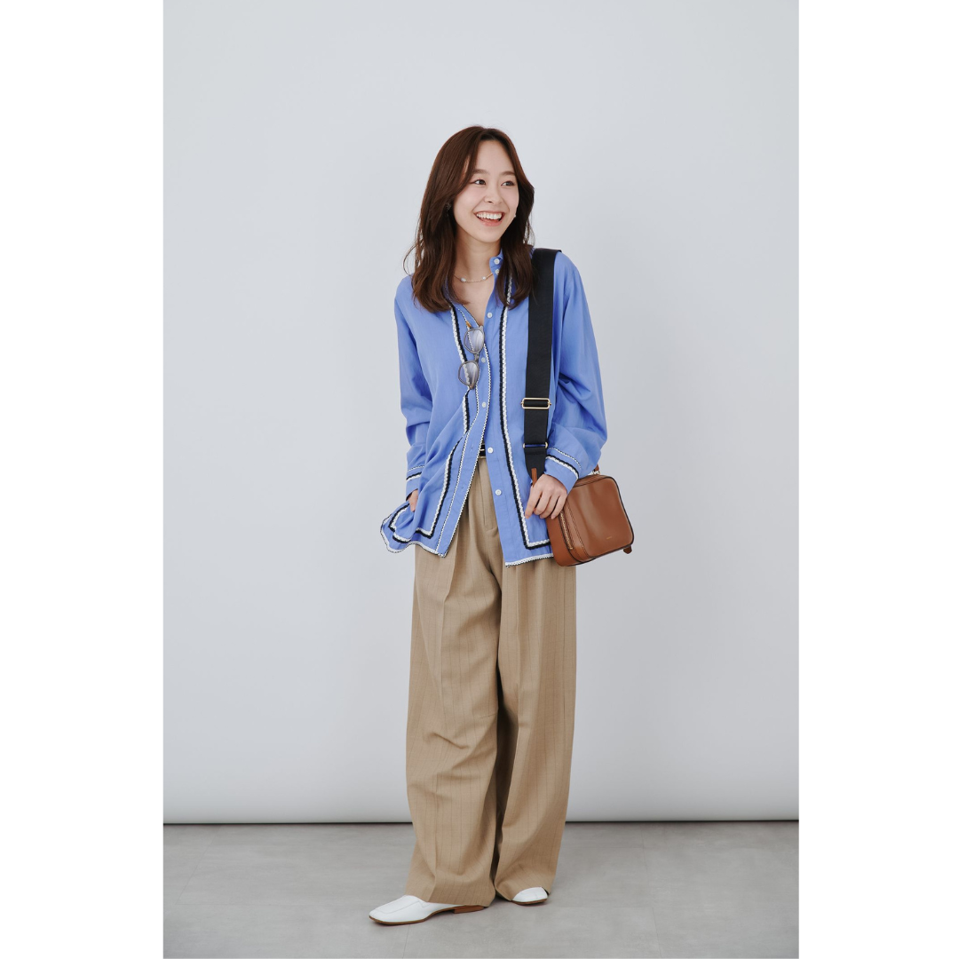 食べ歩きデートでは、快適さと軽やかさを意識したコーデがポイント。レースが施された鮮やかなブルーのシャツが、コーディネートの主役として映え、春らしい爽やかさを演出してくれます。ボトムスには、ゆったりとしたベージュのワイドパンツを合わせて、動きやすさとリラックス感を両立。足元はフラットシューズで軽やかにまとめて、長時間の歩き回りにもしっかり対応。