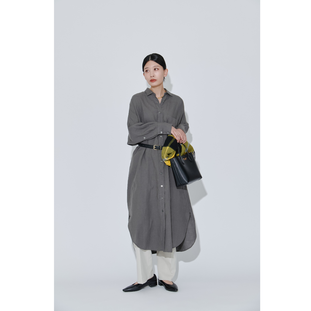 落ち着いた空間で過ごす美術館デートにぴったりな、上品で洗練されたきれいめスタイル。上質なリネン素材のグレーのシャツワンピースは、大人っぽさもありながら、ゆったりとしたシルエットで1枚でもサマになります。ボトムスには、ホワイトのパンツを合わせて軽やかさを。仕上げに、ベルトでウエストマークすることでコーディネートにメリハリがつき、スタイルアップも叶う着こなしに。
