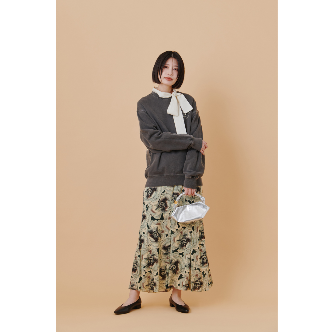 ヴィンテージライクな花柄スカートは、神聖で落ち着いた雰囲気漂う神社仏閣にも自然になじむ1着。トップスにはあえてメンズのグレースウェットを合わせて、大人の余裕漂う甘カジュアルコーデに。ブラウスのボウタイを首元から覗かせれば、デートらしい華やぎと上品な甘さをほんのりプラスできます。バッグはメタリックに輝くシルバーでピリッと引き締め、小粋なムードに。