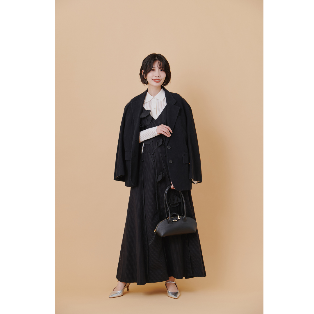 ロマンティックな雰囲気でのディナーデートは、上品さとかわいさの両立がカギ。ブラックのワンピースとジャケットでシックにまとめつつ、インナーに重ねた透け感のあるニットカーディガンがさりげない女性らしさを引き立ててくれます。顔周りはゴールドのイヤリングを添えて、足元はシルバーのパンプスで控えめな華やぎをプラスして。