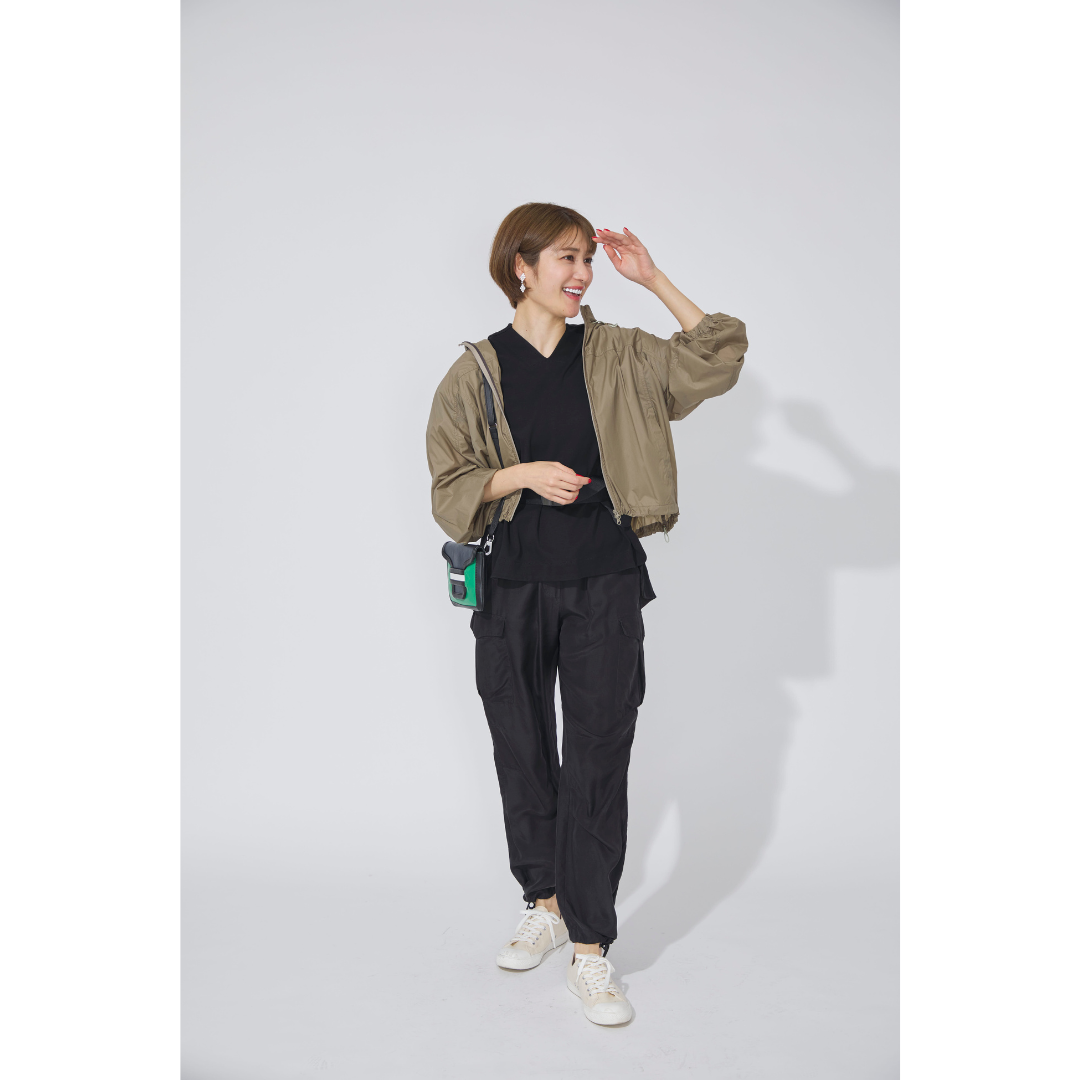 自然やアウトドアを楽しむアクティビティデートでは、動きやすさと快適さが最優先。軽やかなナイロン素材のブルゾンは、風を防ぎつつ気温調整もしやすい、春の変わりやすい天候にも対応してくれる頼れるアイテム。インナーとボトムスはブラックでまとめることで、アクティブな中にも大人っぽさをキープ。