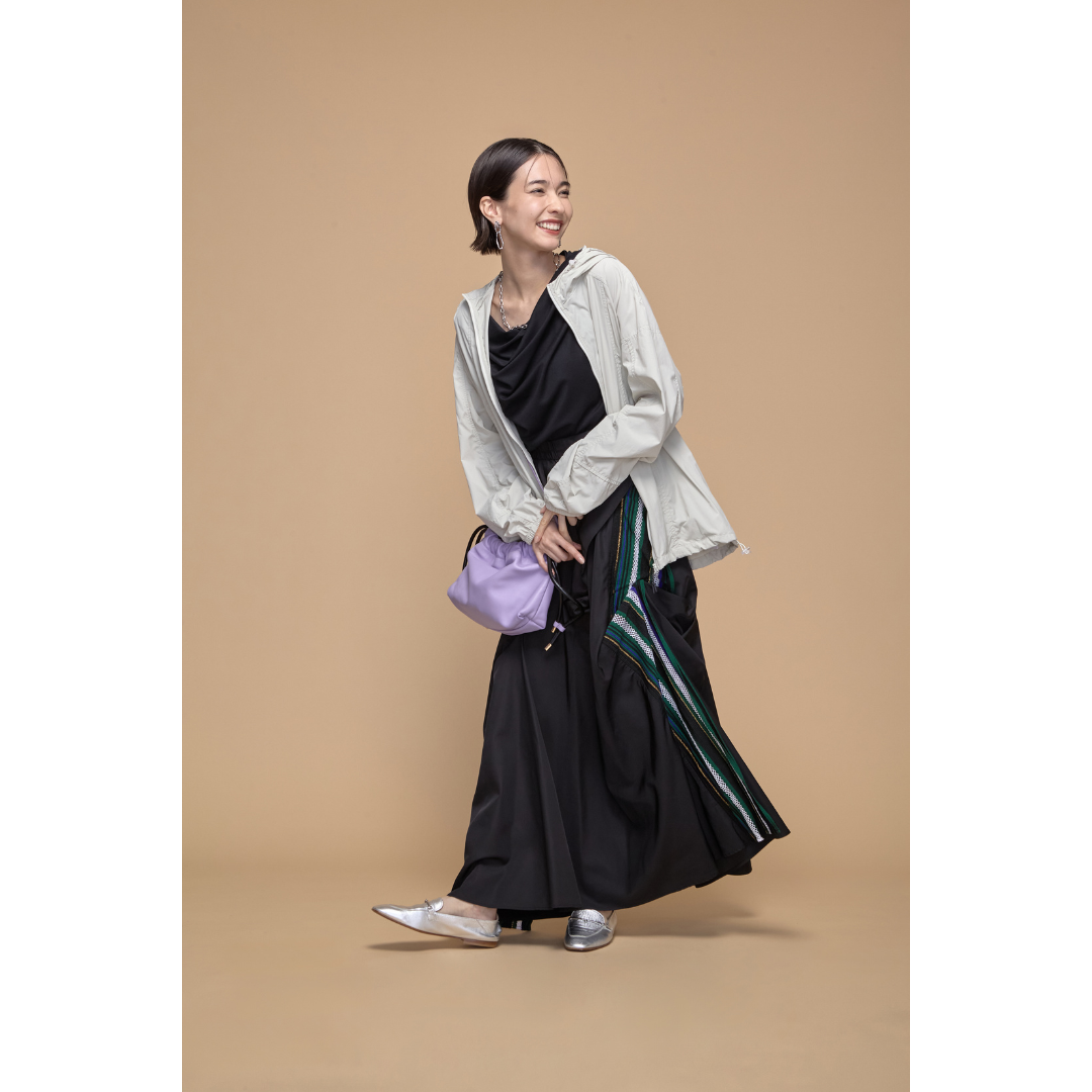 1日中アクティブに動くテーマパークデートでは、動きやすさとおしゃれ見えを両立したスタイルでとことん楽しんで。黒のワンピースをベースにすることで、動きやすさを確保しながらも大人っぽくシックな印象に。上から羽織ったオフホワイトのナイロンアウターは、気温調整にも便利でコーディネートに抜け感をプラスしてくれます。足元は、シルバーのパンプスでアクセントを効かせて。