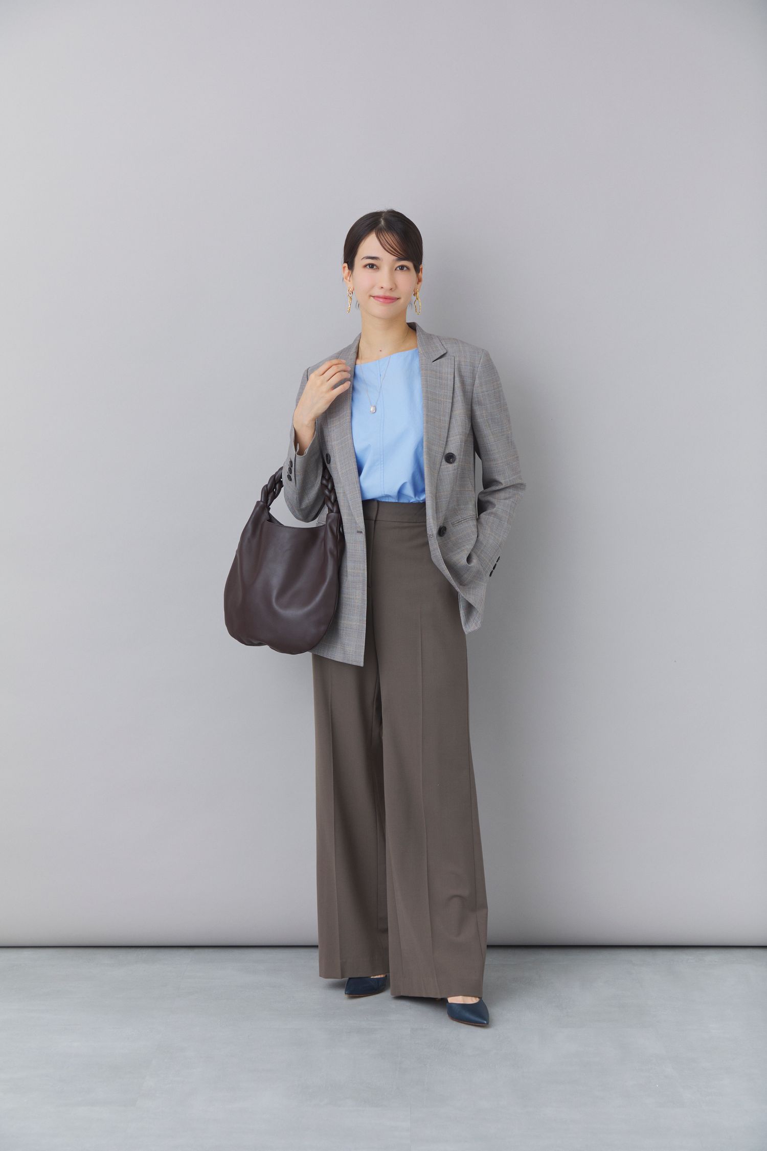 きれいめ見えするチェックジャケットにワイドパンツを合わせた、オフィススタイルが第4位にランクイン。ダブルブレストのジャケットが上品な印象を引き立てつつ、ゆとりのあるワイドシルエットのパンツがこなれ感を演出します。インナーには爽やかなブルーのブラウスを合わせ、落ち着いたトーンに程よい軽やかさをプラスして。
