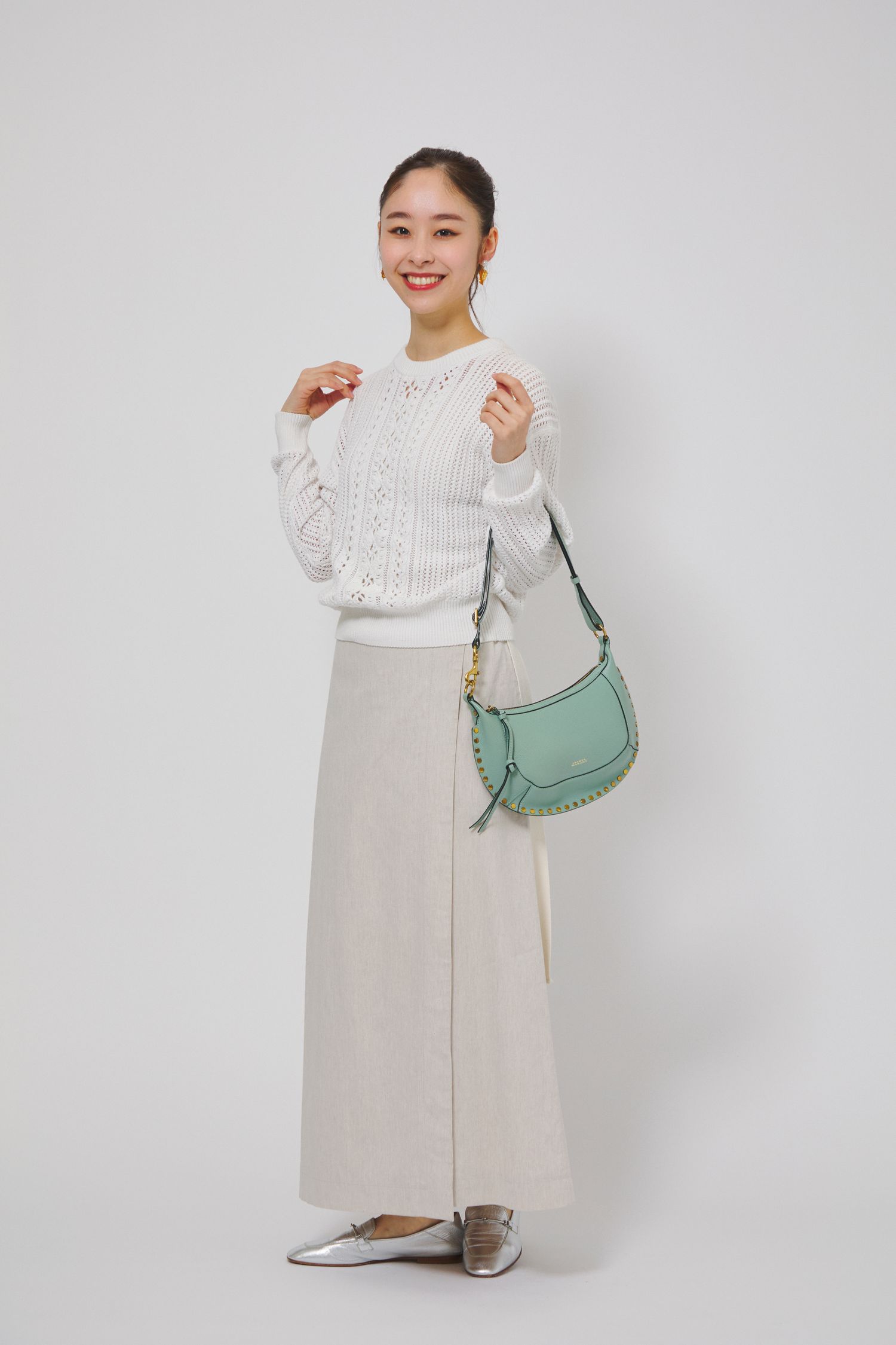 第3位は、繊細な編み柄が印象的なホワイトニットに、ナチュラルな風合いのロングスカートを合わせた、上品なフェミニンコーデ。透け感のあるニットが軽やかさを演出し、シンプルながらも表情のある着こなしに仕上がります。足元はシルバーのフラットシューズで抜け感をプラスしつつ、ミントグリーンのバッグを添えてコーディネートのアクセントに。