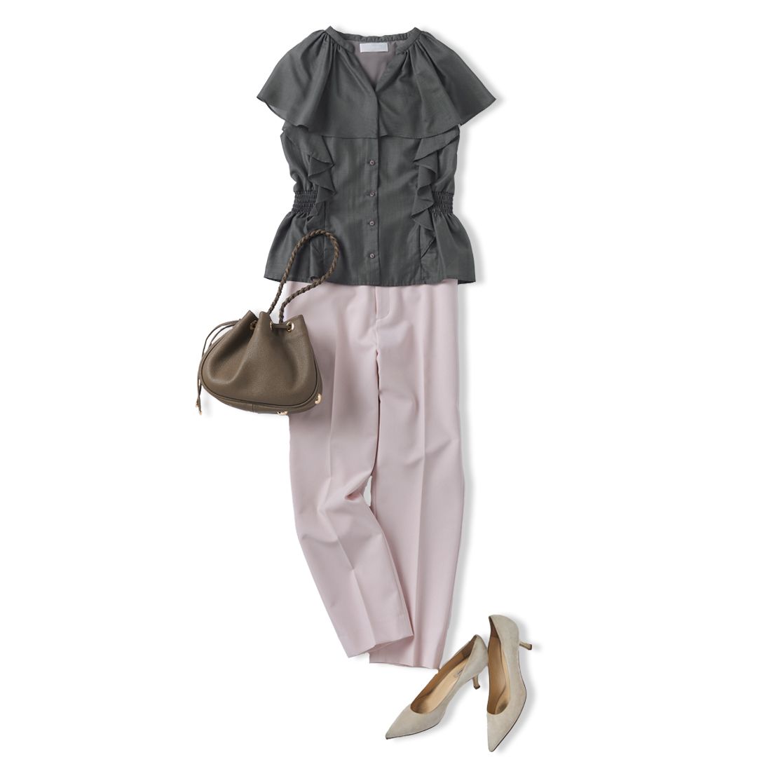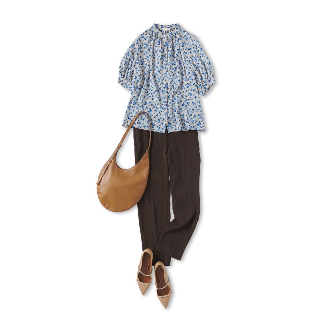 トップスには、ギャザーをたっぷり施した丸みのあるシルエットのブラウスをセレクト。上半身に立体感をプラスすることで、華奢なボディラインを自然に補いながら、全体のバランスを引き上げてくれます。淡いブルーの小花柄も、繊細なデザインを得意とする骨格ウェーブにぴったり。バッグは、骨格ウェーブの曲線的なボディラインを引き立てる、ラウンドシルエットのレザーショルダーバッグをチョイス。