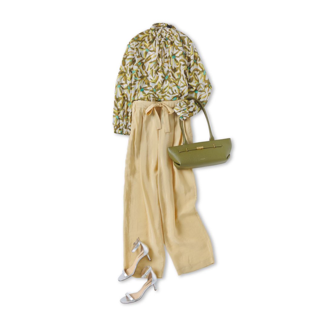 春夏らしい軽やかなムードを引き立てる、08サーカス(08sircus)のイージーパンツは、薄手のオーガンジー素材で骨格ウェーブのボリュームが出やすい下半身を自然にカバー。トップスには、華やかさを引き立てる花柄ブラウスをセレクト。大胆なプリントと首元に施されたギャザーが、寂しく見えがちな上半身に立体感をプラスし、骨格ウェーブの魅力を引き出します。