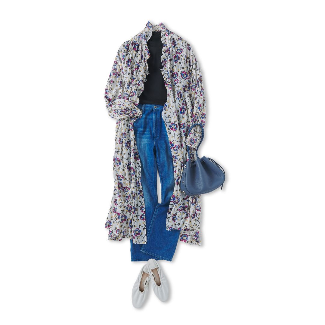 Tシャツの上には、カシュクールワンピースをラフに羽織って、コーデに動きと華やかさをプラス。華奢な花柄とふんわり軽やかな素材感が、骨格ウェーブのソフトな質感にフィットし、魅力を引き立てます。手元には、コロンと丸みを帯びたブルーのドロストバッグを合わせて、コーデ全体を引き締めながら爽やかな印象に。