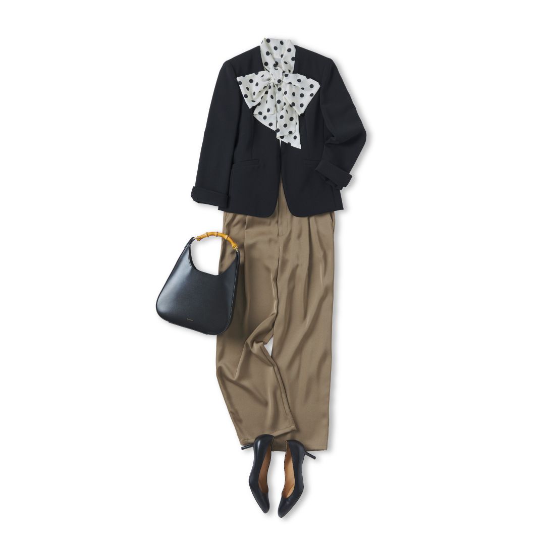 トップスには、骨格ウェーブに似合う要素がぎゅっと詰まったボウタイ×ドット柄のブラウスを合わせて、顔まわりに華やかさをプラス。上半身にポイントを置くことで視線が引き上がり、バランスよく着こなせます。仕上げにノーカラージャケットを羽織れば、きちんと感を求められるシーンにも◎。