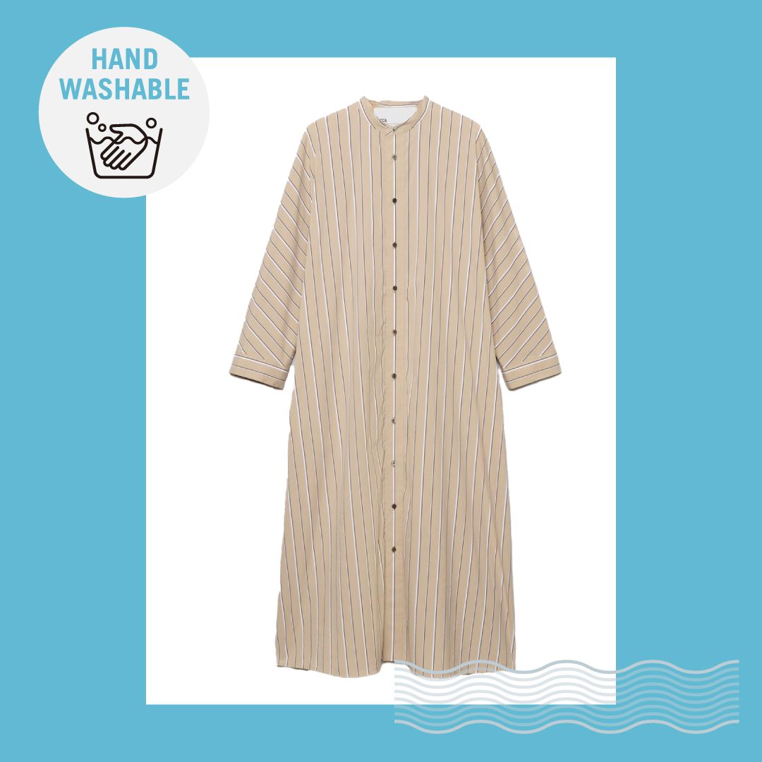 通勤から休日まで頼れる、着回し力抜群の長袖シャツワンピース。パンツをレイヤードしたり、ベルトでシルエットを変えたり、日除けや冷房対策に羽織ったりと、スタイリングは自由自在です。ティッカのシャツワンピースは、ノーカラーのゆったりとしたシルエットで、さらりとラフに纏える1枚。程よくストレッチの効いたしなやかな素材で、心地よく過ごせます。