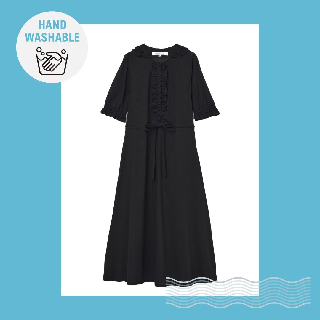 フリルカラーにピンタックデザイン、クルミボタンがあしらわれたビリティス・ディセッタン(Bilitis dix-sept ans)のワンピース。甘めデザイン×ブラックで、大人女性にぴったりの上品なフェミニンスタイルを楽しめます。裏地がなく、1枚仕立てで涼しく着られるのも嬉しいポイント。シワになりにくい素材感で、旅先でも活躍してくれます。