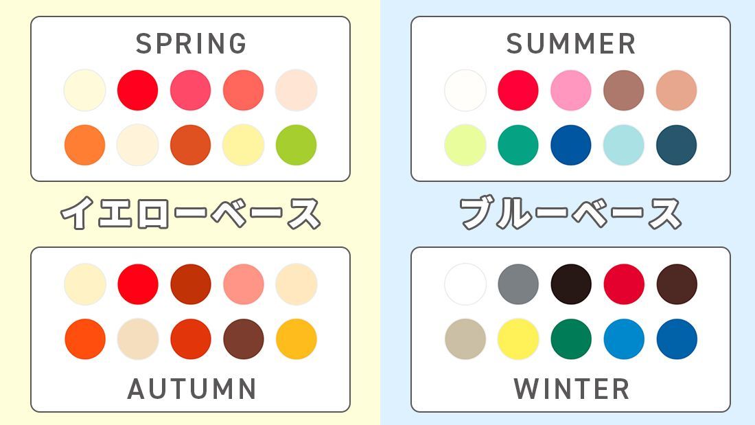 パーソナルカラー診断とは、一人ひとりが生まれ持った髪色や肌色、瞳の色から似合う色を診断するメソッド。パーソナルカラーを知ることで、自分に似合うカラーテイストを選ぶことができ、今よりもっとファッションを楽しむことができます。診断結果は、大きく「イエベ春(スプリング)」「ブルベ夏(サマー)」「イエベ秋(オータム)」「ブルベ冬(ウィンター)」の4タイプに分類され、それぞれに似合う色があります。