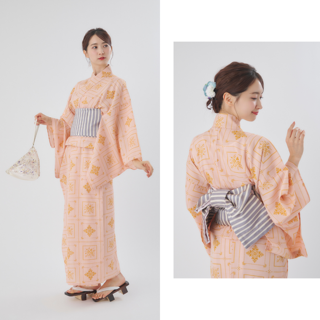 イエベ春(スプリング)タイプさんにおすすめの浴衣1点目は、マサコ テラニシ(Masaco Teranishi)の別注浴衣のピンク。肌に自然に溶け込むような淡いピーチピンクの色味が、顔色をパッと明るく見せてくれます。柔らかく温かみのある印象で、イエベ春タイプさんの持つ「可愛らしさ」や「親しみやすさ」を引き立ててくれる1着です。