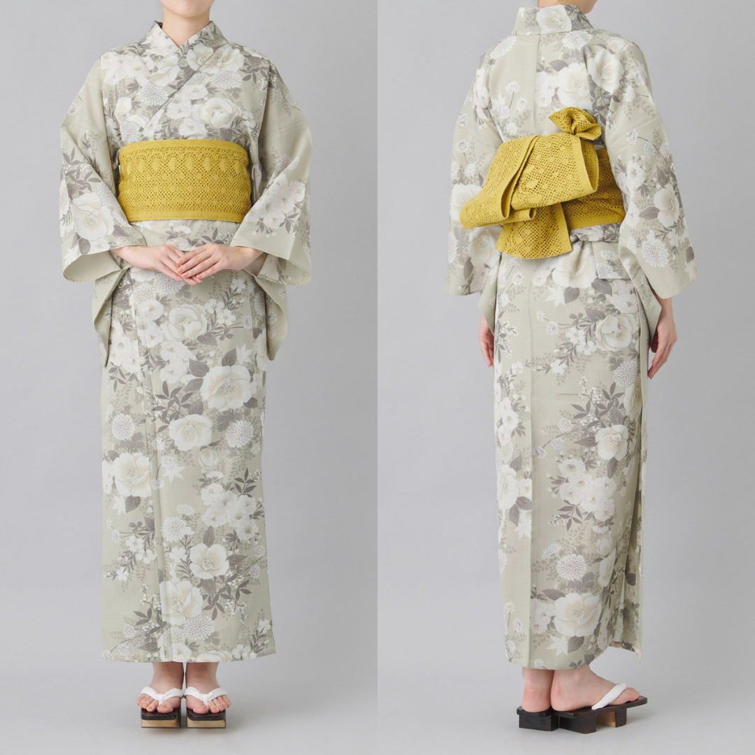 イエベ秋(オータム)タイプさんにおすすめの浴衣2点目は、椿や菊、撫子などの花々の中に、うさぎがひょっこり顔を出す「椿うさぎレース柄」。イエベ秋タイプさんの肌に馴染むまろやかなくすみベージュカラーが、上品でふんわり優しげな印象を演出します。