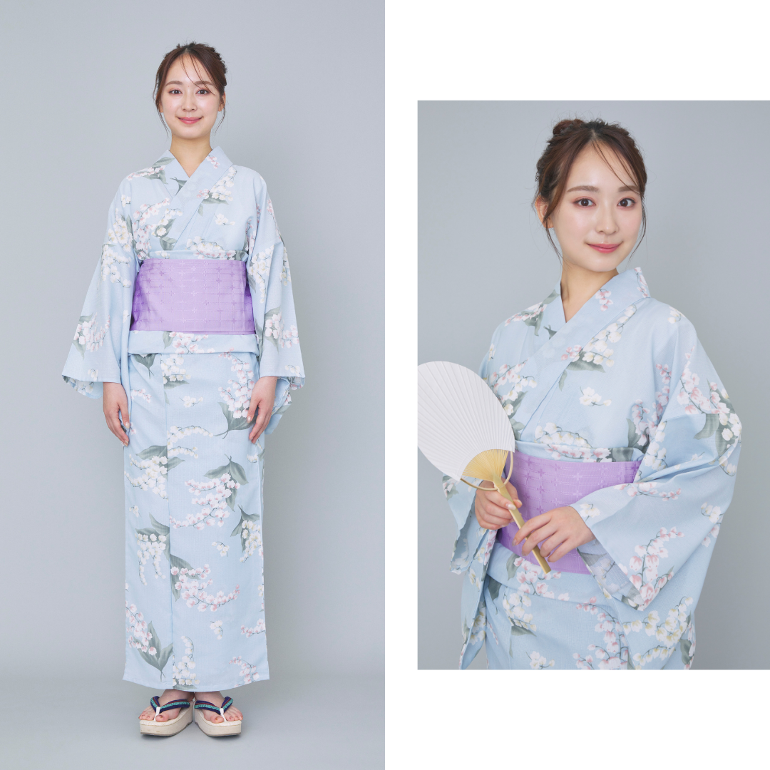 ブルベ夏(サマー)タイプさんにおすすめの浴衣1点目は、やわらかなペールブルーに愛らしく咲くすずらんが目を引く「すずらん柄」。涼しげなトーンは、透明感のある肌が魅力のブルベ夏タイプさんにぴったり。