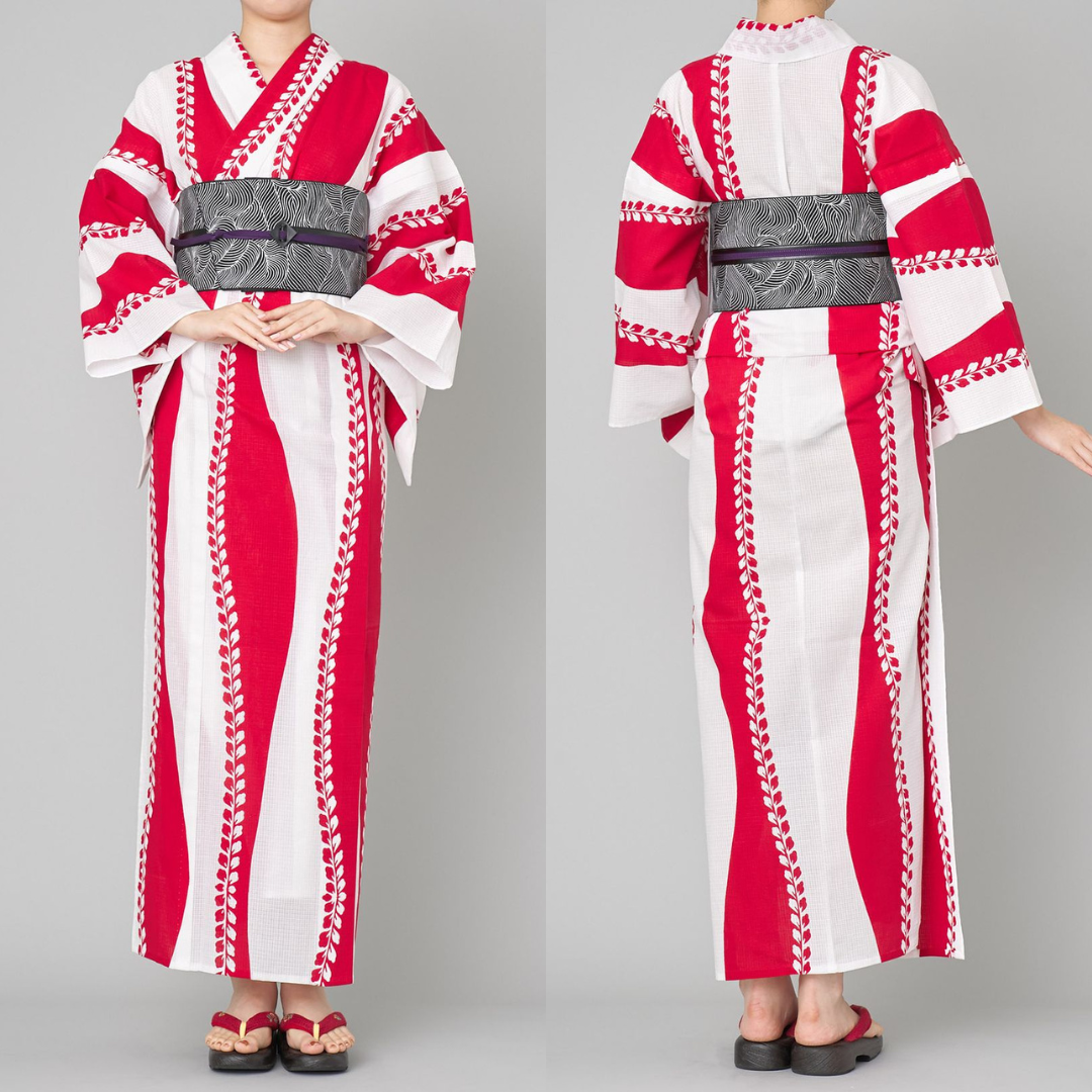 ブルべ冬(ウィンター)タイプさんにおすすめの浴衣1点目は、波打つ立涌模様の縁にあしらわれた藤の柄がユニークな「立涌藤柄」。青みがかった鮮やかな赤とクリアな白が、ブルベ冬タイプさんの肌の透明感を引き立て、洗練された印象を演出してくれます。粋な雰囲気がありながら、女性らしさも感じさせる華やかな1枚です。