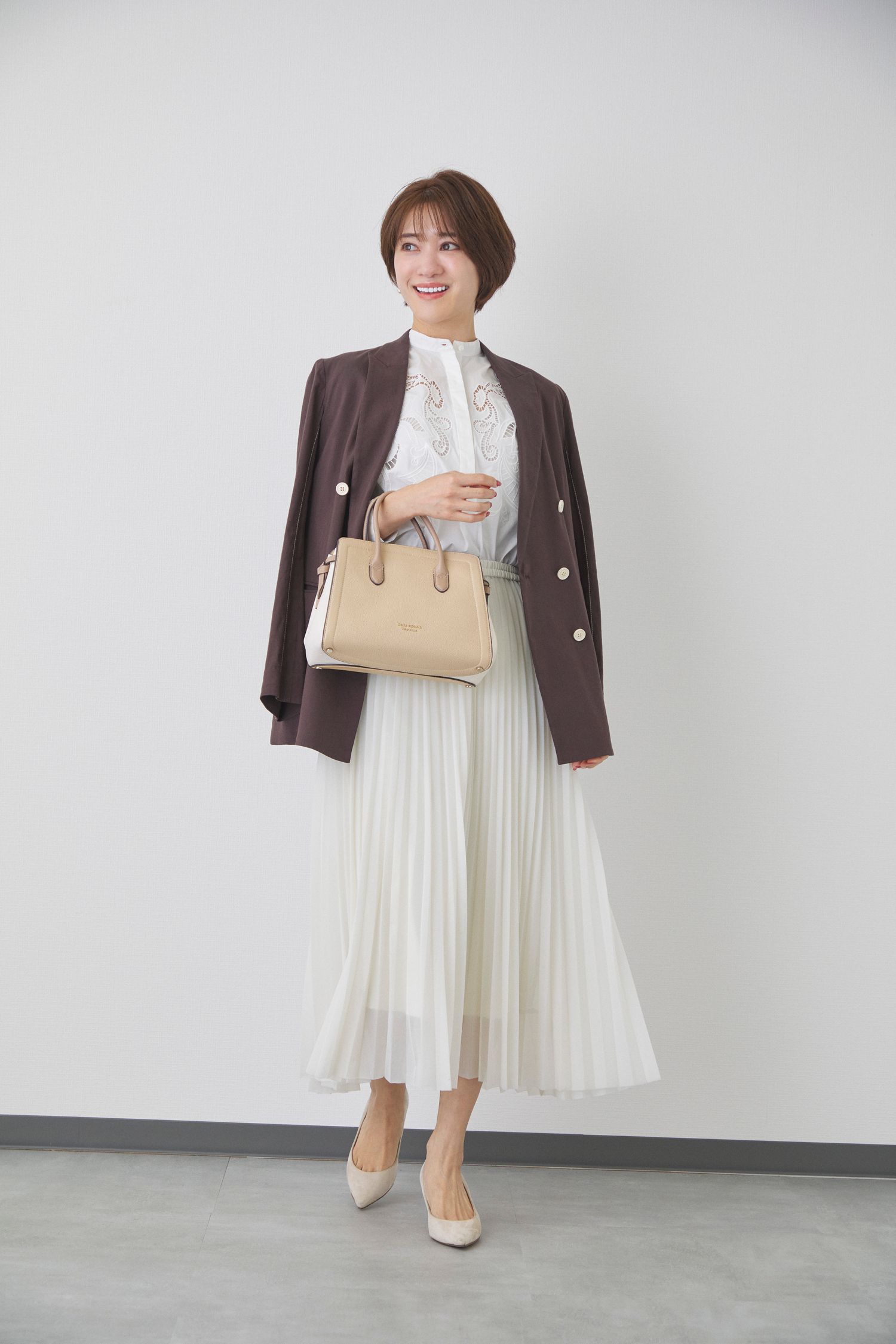 長袖シャツにジャケットを羽織ったスタイルは、最低気温15度の日の通勤にぴったり。清潔感溢れる上下白のコーディネートには、ブラウンのダブルジャケットを合わせて大人っぽく好印象に仕上げて。小物はベージュで柔らかくまとめれば、上品な女性らしさが一層引き立ちます。
