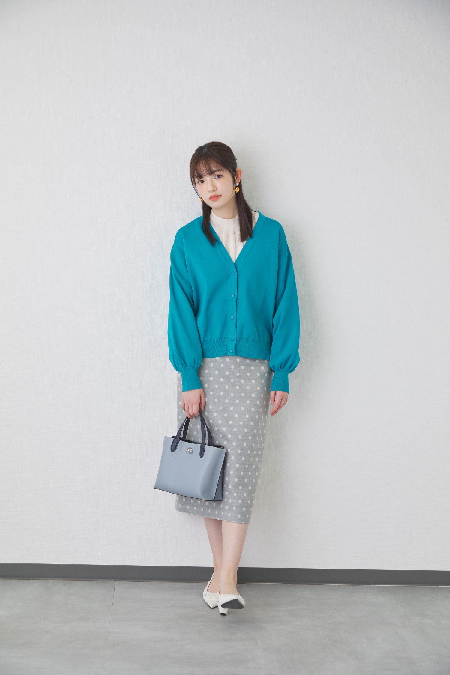 インナーにはフレイ アイディー(FRAY I.D)のパフスリーブシャツを忍ばせ、ボトムスはトゥモローランドコレクション(TOMORROWLAND collection)のドット柄のタイトスカートをセレクト。