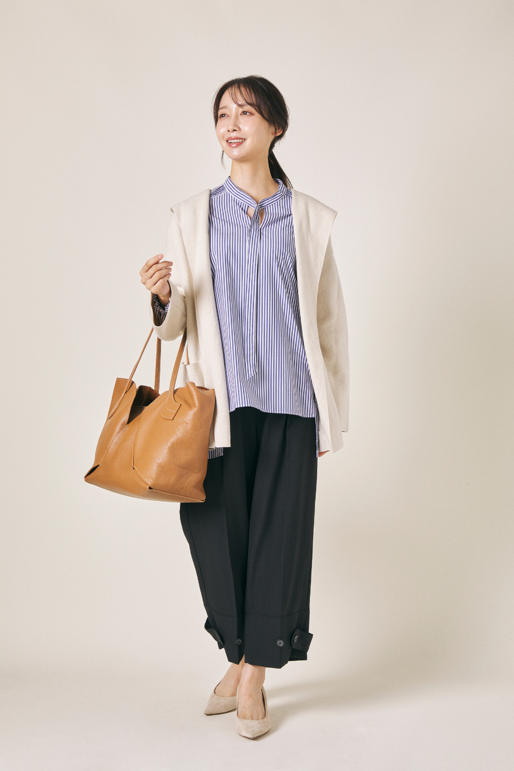 気温の変化に合わせて体温調節をしやすい長袖シャツ×カーディガンのスタイル。ギャルリー ヴィー(GALERIE VIE)のカーディガンは、大きなフードとゆったりとしたシルエットで、リラックスムードが漂います。きれいめなシャツとパンツを合わせれば、エフォートレスなお仕事コーデに。