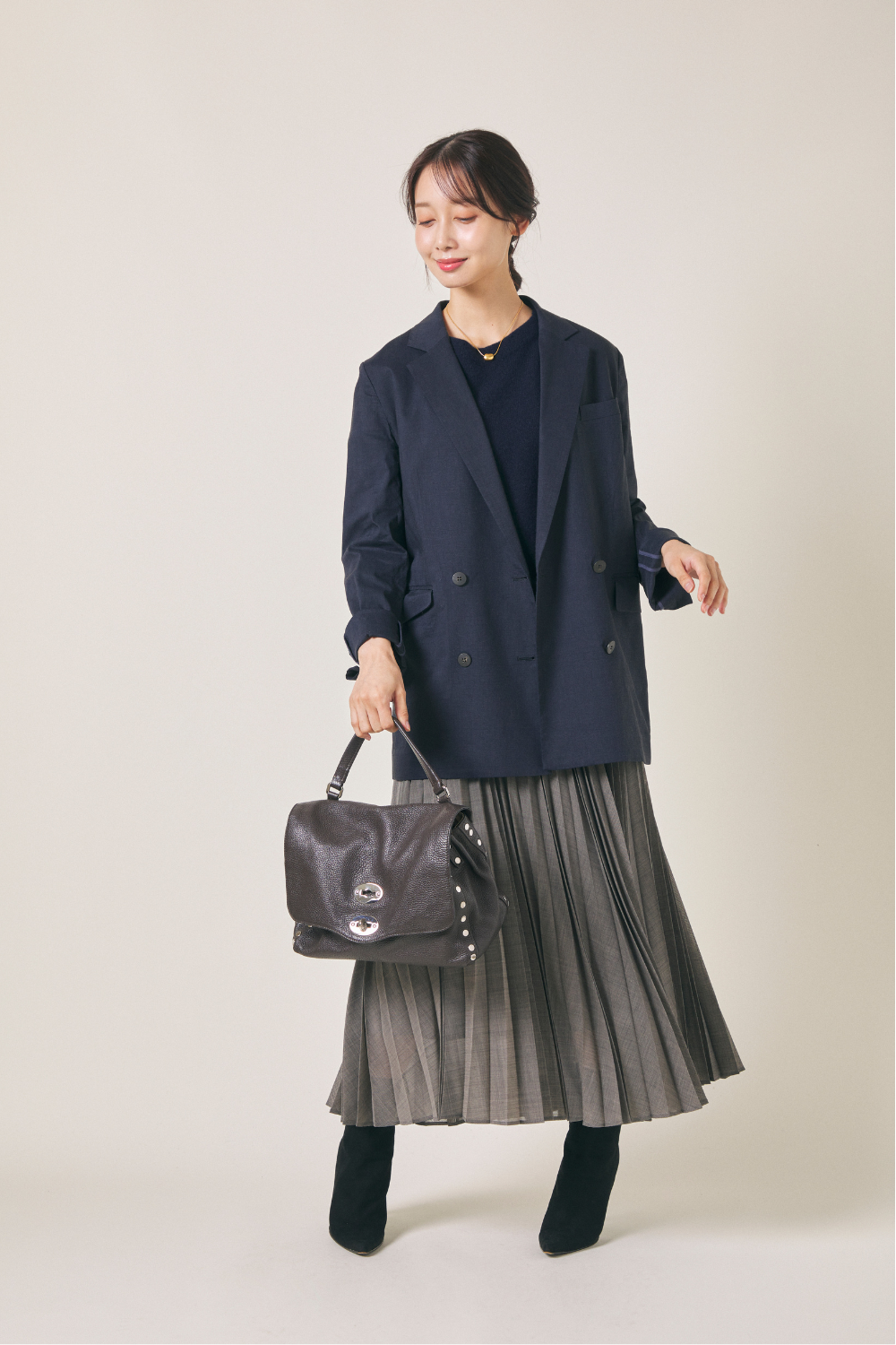 女性らしいプリーツスカートにメンズライクなセオリー(Theory)のダブルジャケットを合わせることで、甘さにきちんと感をプラスしてくれます。