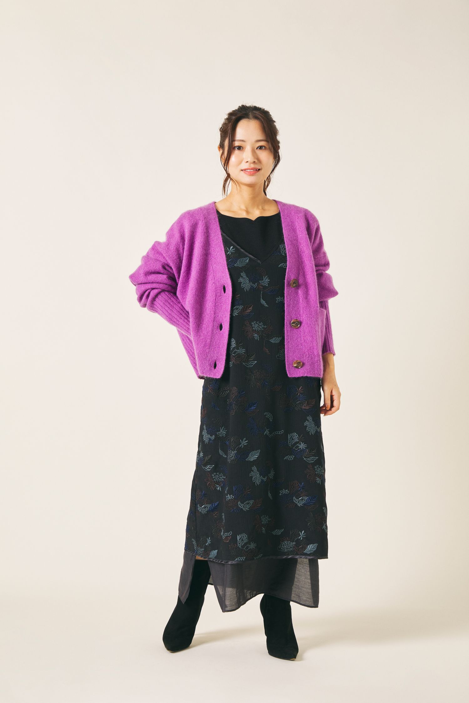 パープルの色味が映えるティッカ(TICCA)のニットカーディガン。フェミニンなモノトーンのワンピースに合わせるだけでこなれ感を演出できます。