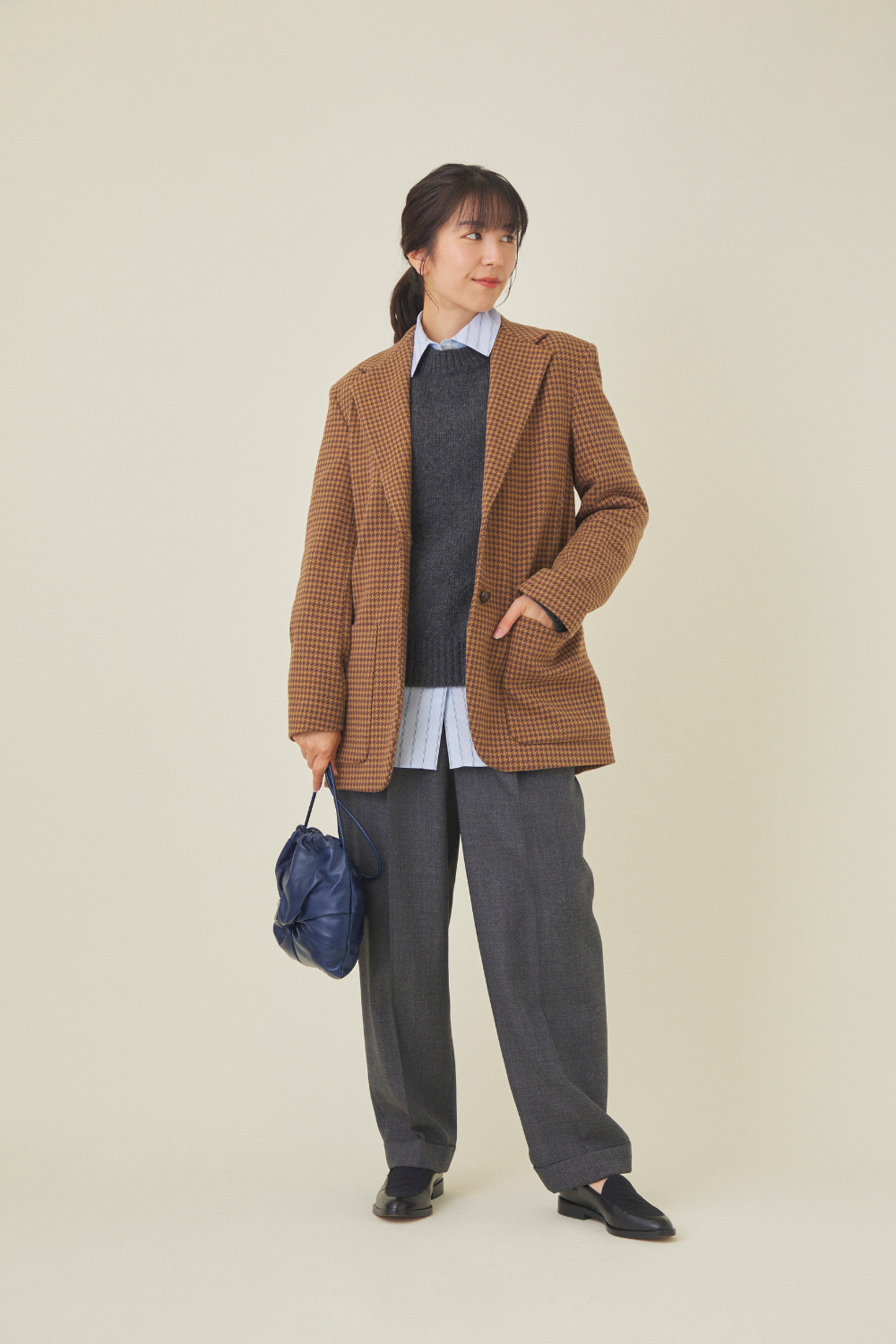 シャツ×ニットのレイヤードスタイルに、チェック柄のテーラードジャケットを羽織って、暖かさを確保したオフィスカジュアルコーデ。グレーニットからストライプシャツを覗かせれば、ほっこり感が緩和され、コーディネートがキリッと引き締まります。足元はフラットローファーで、トラッドな印象を加速。