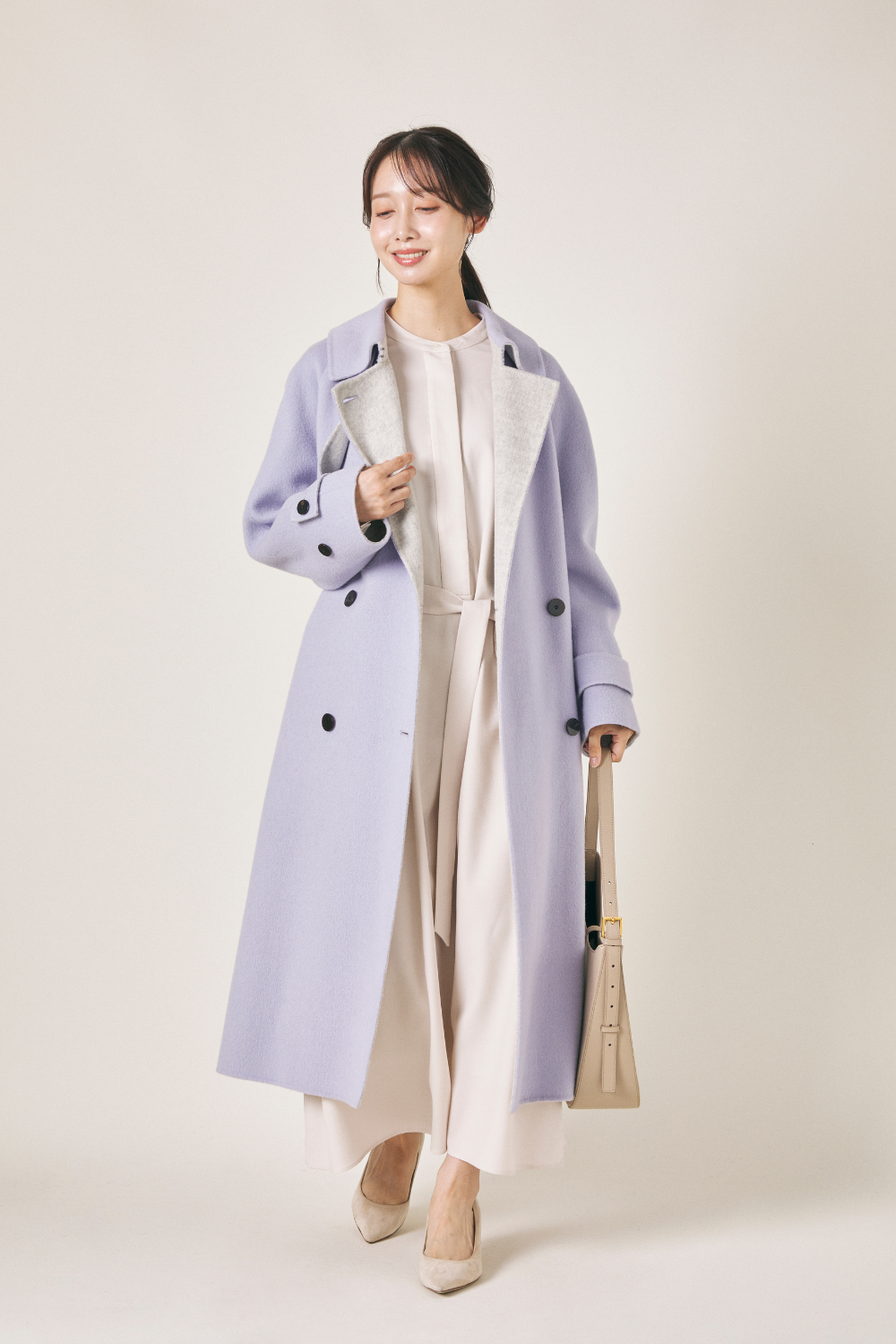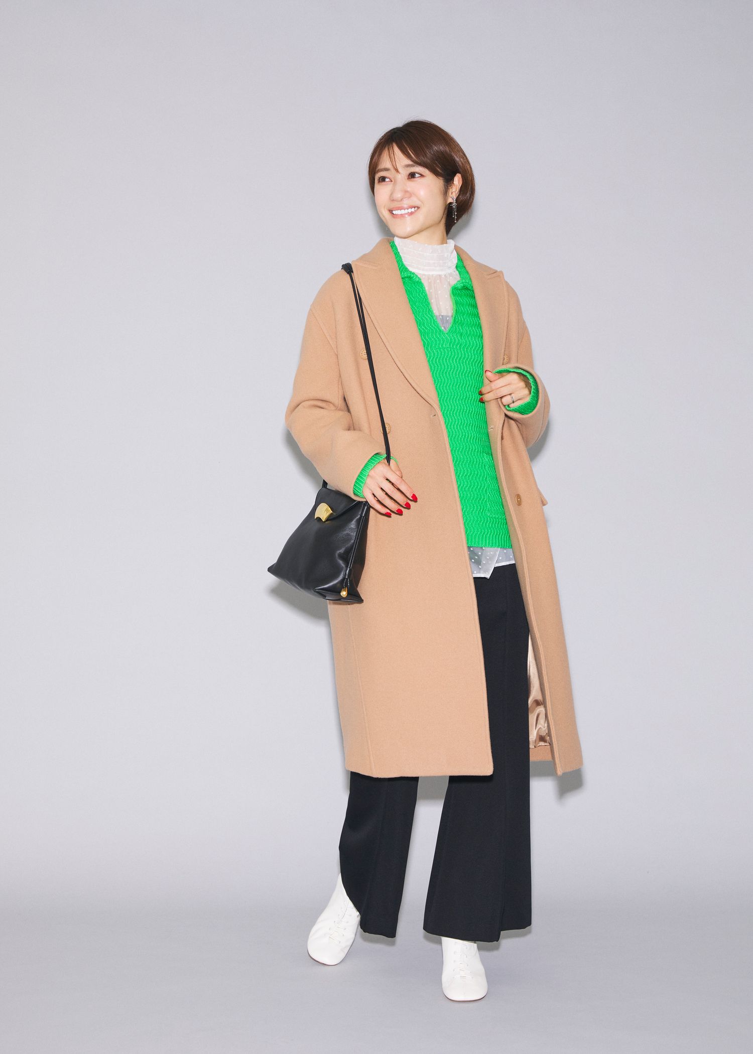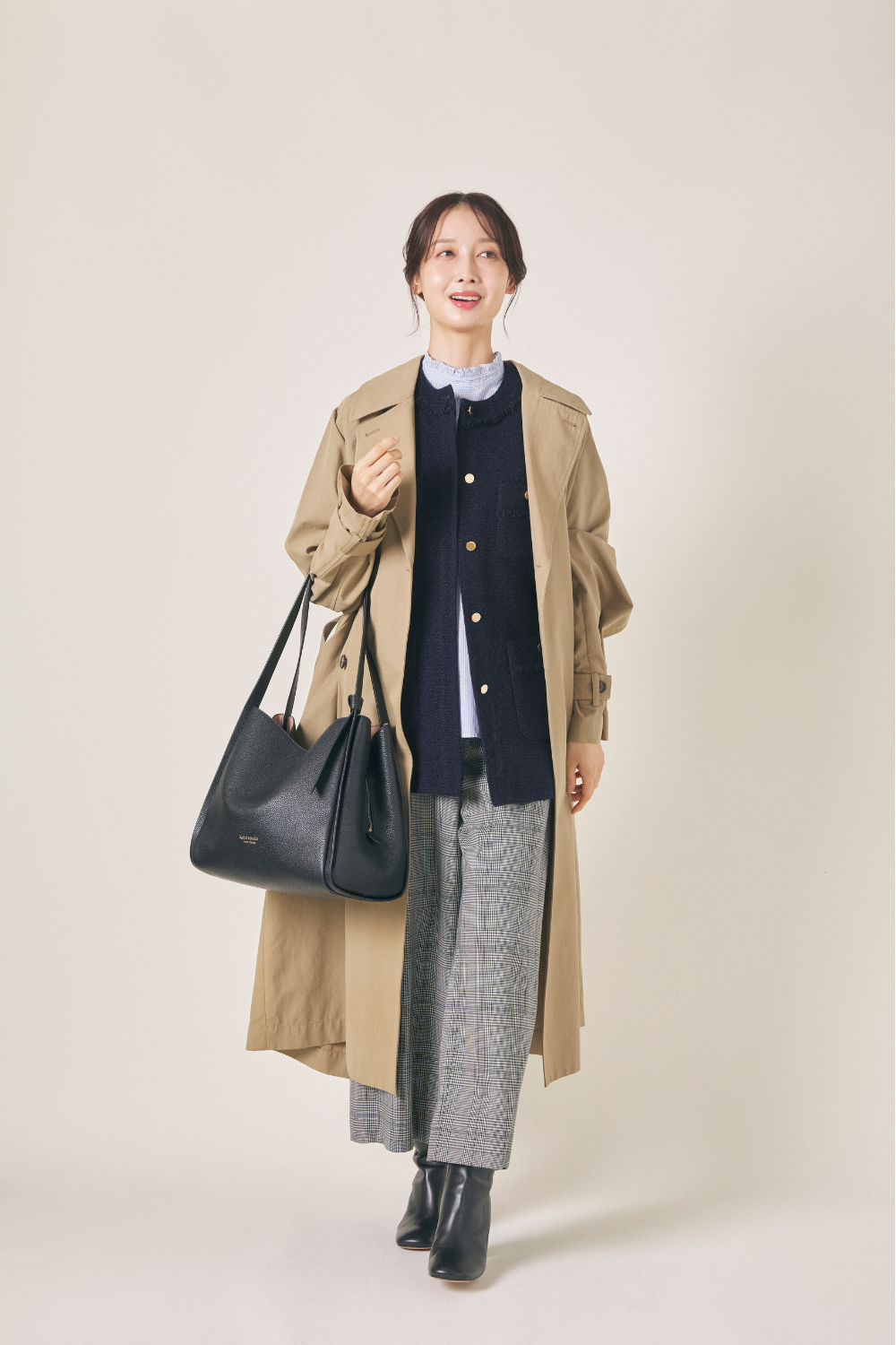 朝晩が冷え込む日は、その上からコートを羽織るのがおすすめ。今回は、全体のバランスを崩さず、暗くなり過ぎないやさしいベージュカラーのコートをチョイスしました。