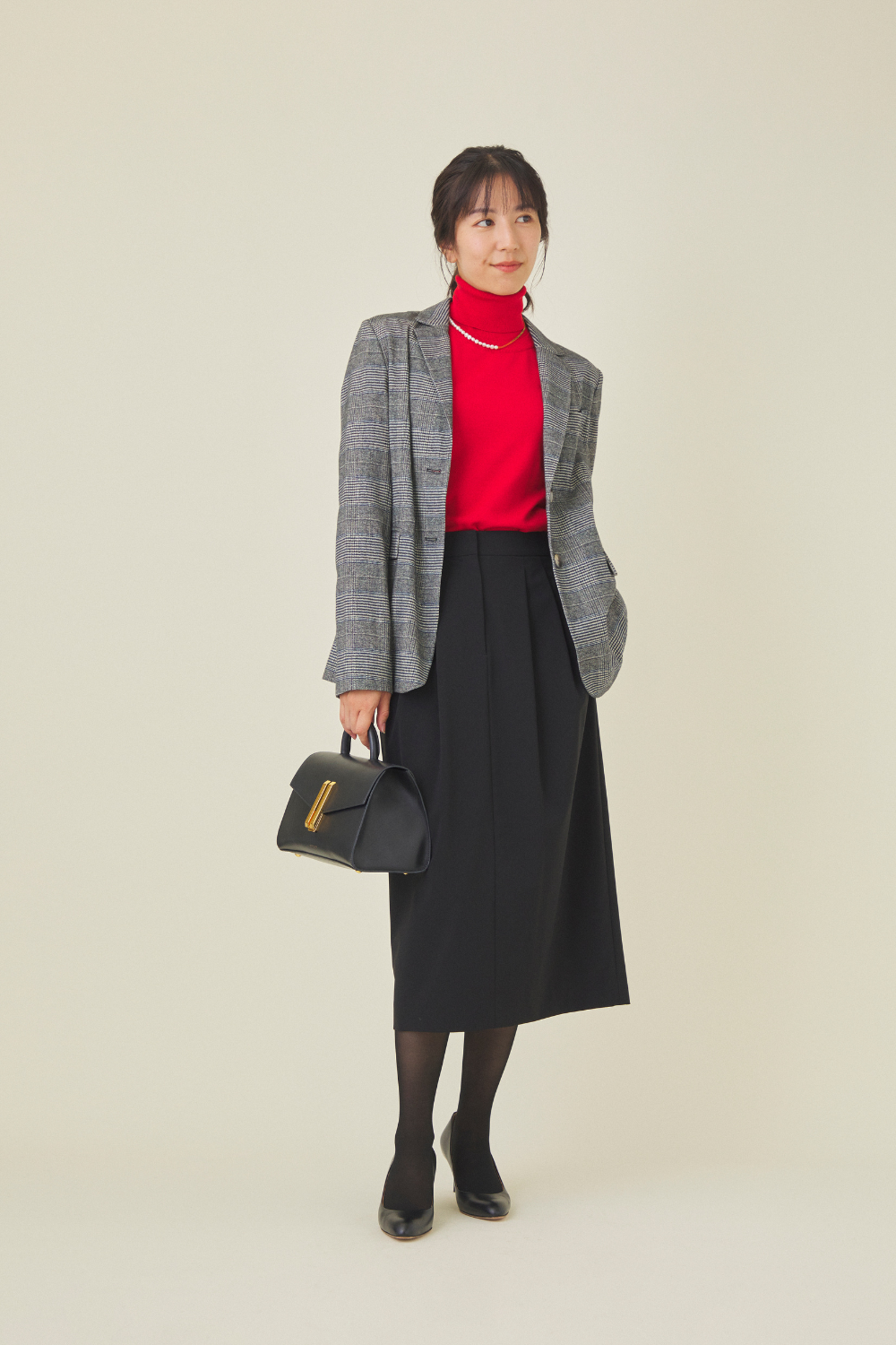 オフィスコーデで定番なブラックのスカートに赤のタートルネックを合わせた大人スタイル。コーディネートのアクセントになるラッピンノット(RAPINKNOT)の赤のタートルネックは、薄手のコットンナイロン素材で春や秋にぴったり。その上から、クラシックな雰囲気漂うチェック柄のジャケットを羽織れば、都会の洗練された大人オフィスコーデの完成です。