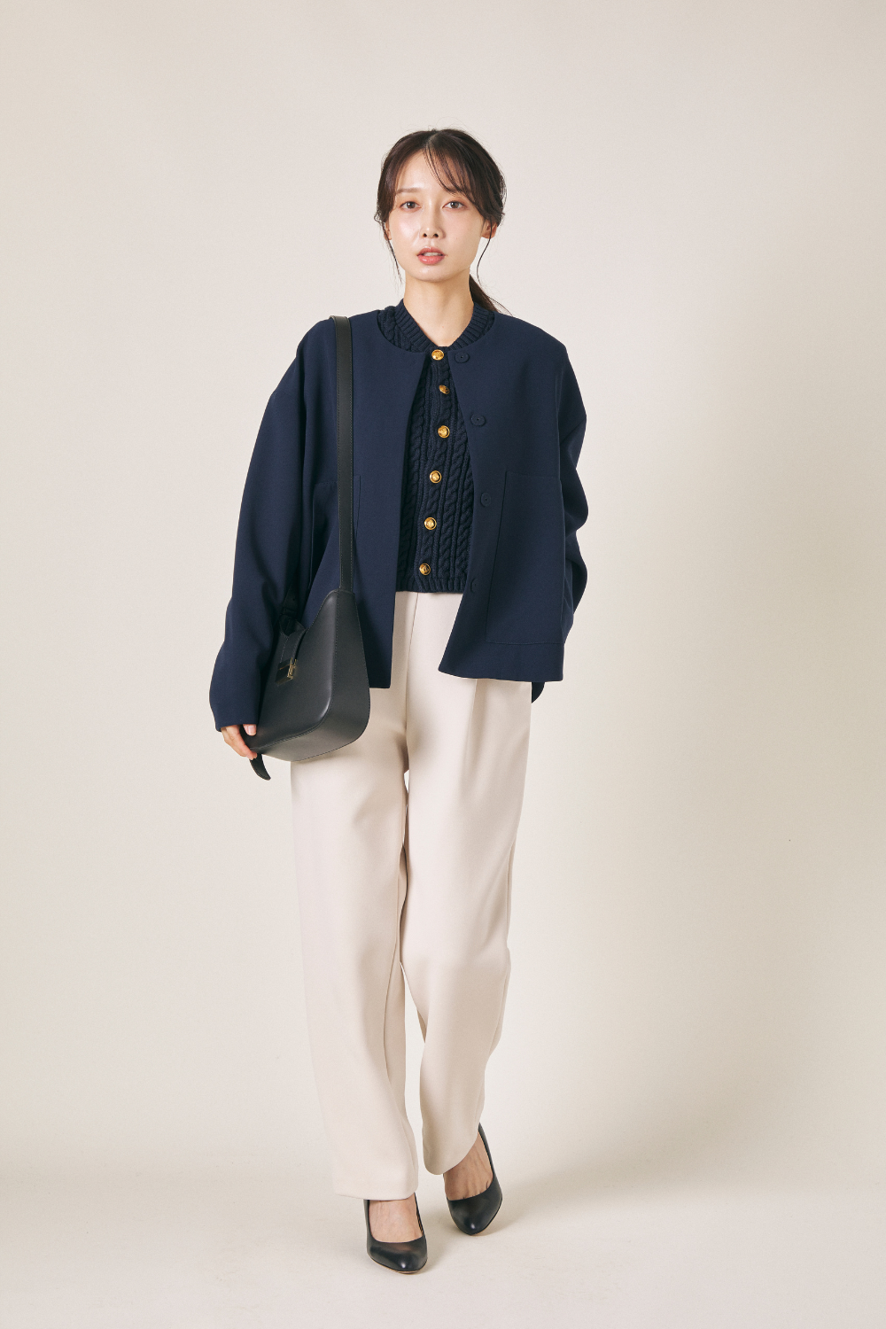 朝晩の寒暖差に対応できるアドーア(ADORE)のノーカラーブルゾンは、インナーのカーディガンの存在感を消さずに上品さを添えてくれます。