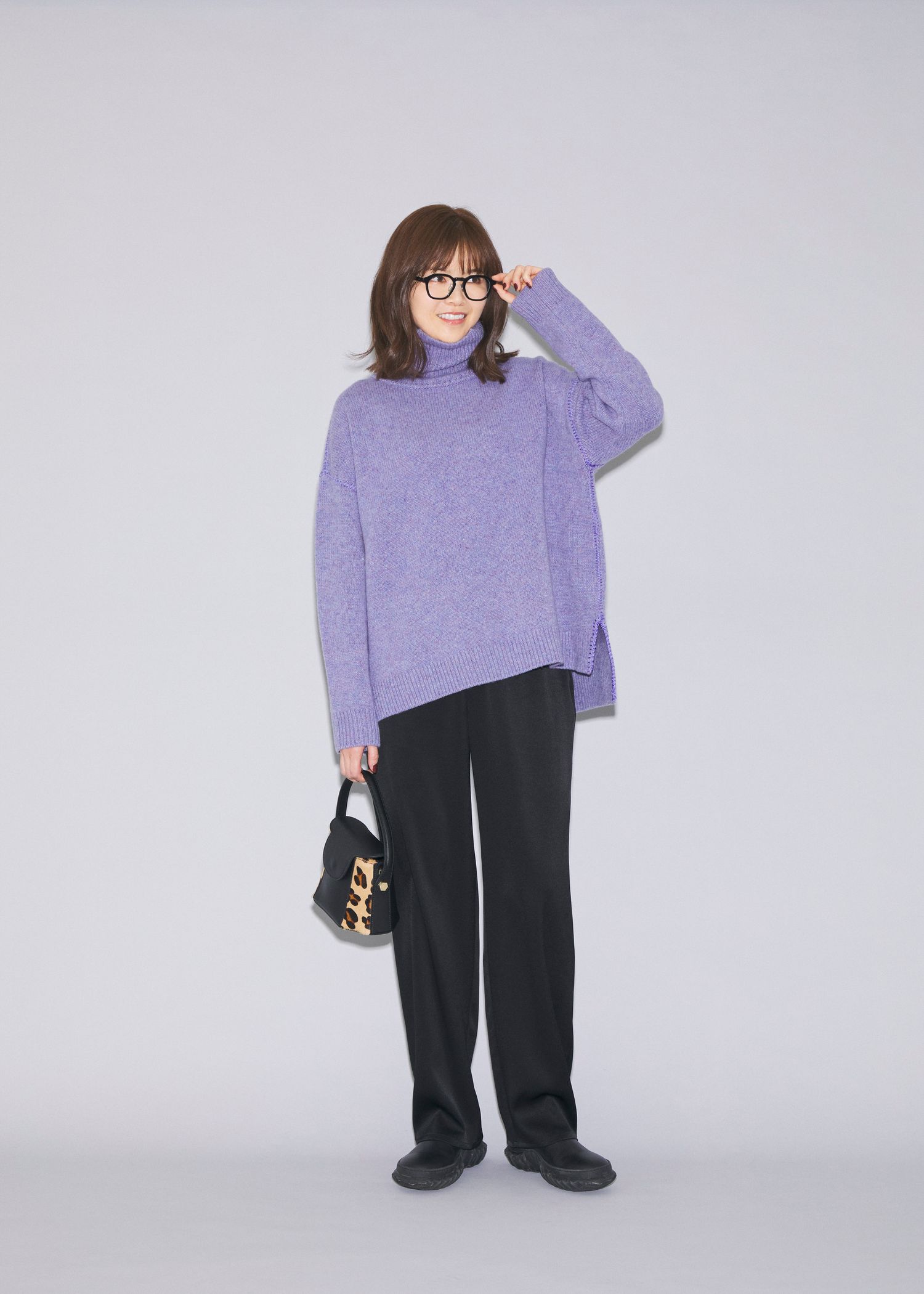 暖かい日はアウターなしで、ニット1枚でおでかけするのもおすすめ。ラッピンノット(RAPINKNOT)のパープルカラーのハイネックニットは、さりげなく入ったステッチと身幅に余裕を持たせたデザインで1枚でも存在感抜群。