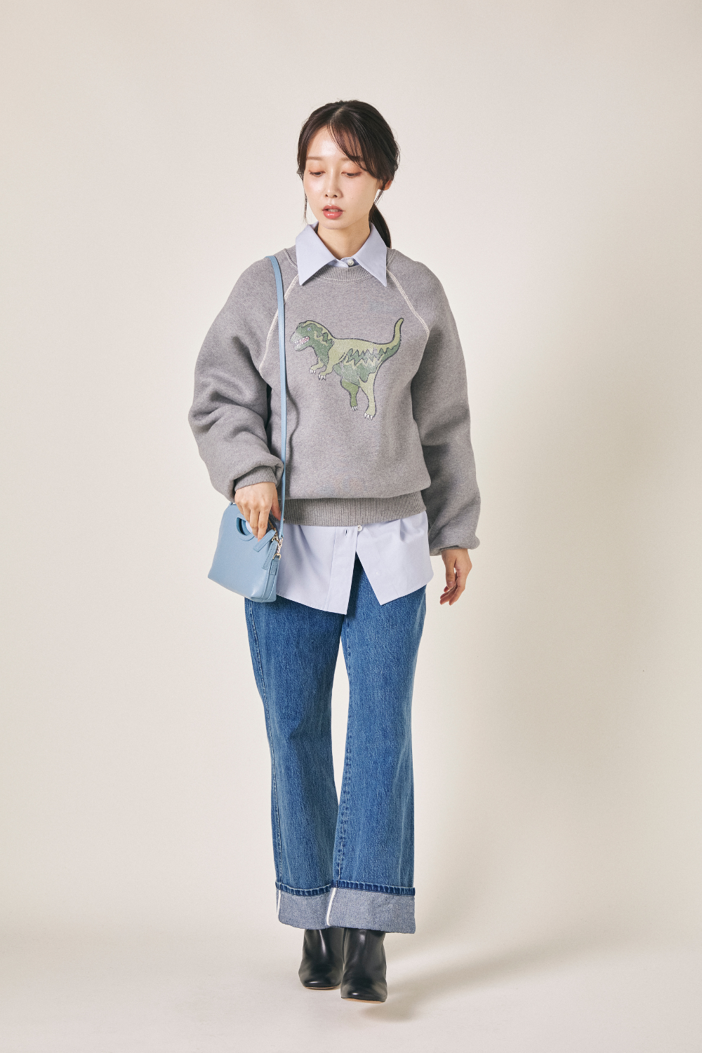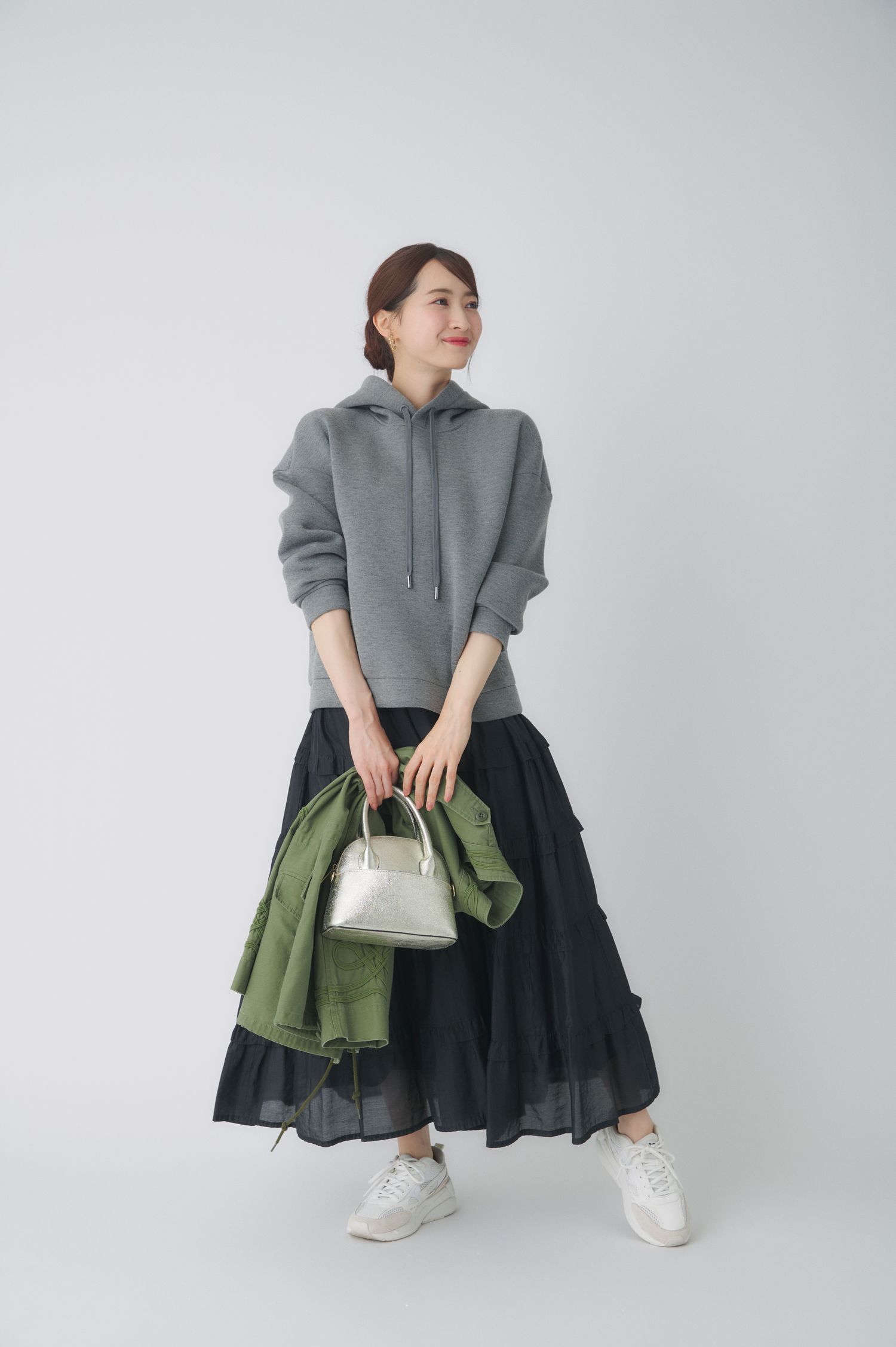 滑らかでハリのある質感が上品なスウェットに、ボリュームたっぷりのフレアスカートを合わせて甘さを足したカジュアルコーデ。足元はスニーカーで軽快にまとめて、抜け感をプラスして。ライトアウターが1枚あれば、気温が下がる朝晩も安心です。