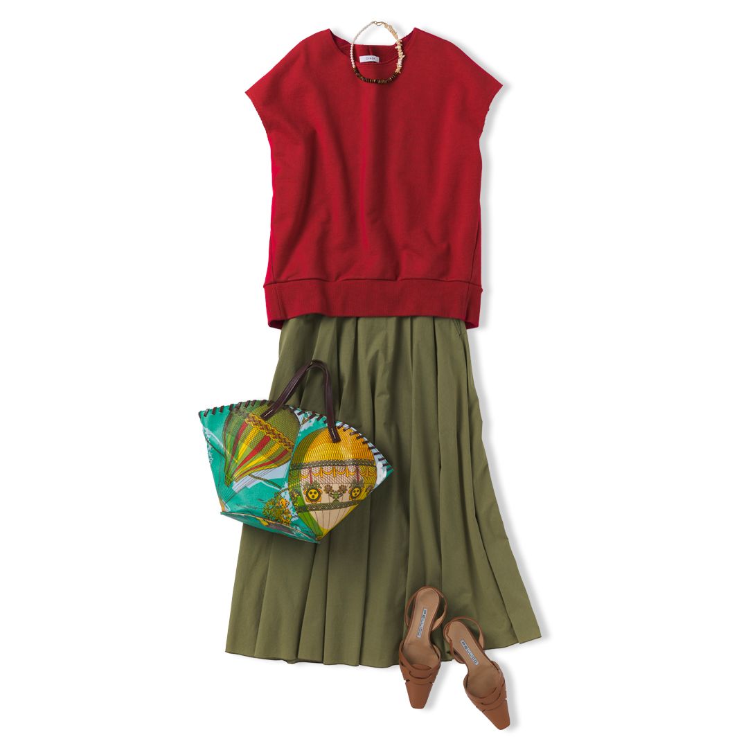 骨格ナチュラルタイプの方がスカートを選ぶ際は「丈」に注目するのがおすすめ。膝下丈・ふくらはぎ丈・アンクル丈・マキシ丈など長めの丈のアイテムを選んであげると、全体のバランスが取れてスタイリッシュな印象に。シルエットは、フィット感がありすぎるとアンバランスな印象になってしまうので、ゆとりのあるスカートを選ぶようにしましょう。すっきりとしたストレートや、ウエストから大きく広がるボリューム感のあるフレアーが似合います。