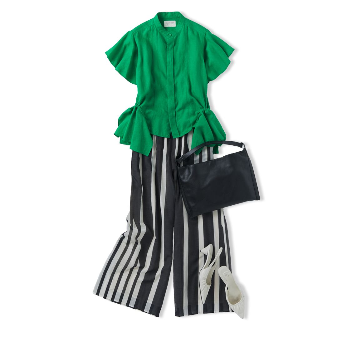 ワイドパンツ×ゆったりしたブラウス×大きめのバッグで構成した、骨格ナチュラルタイプにぴったりなオフィスカジュアルコーデをピックアップ。パンツもトップスもリラクシングなシルエットのものですが、モノトーンカラーのアイテムを選ぶことでカジュアルになりすぎず、引き締まった印象になります。