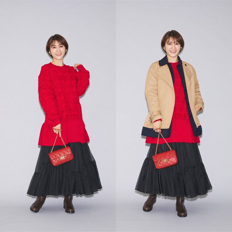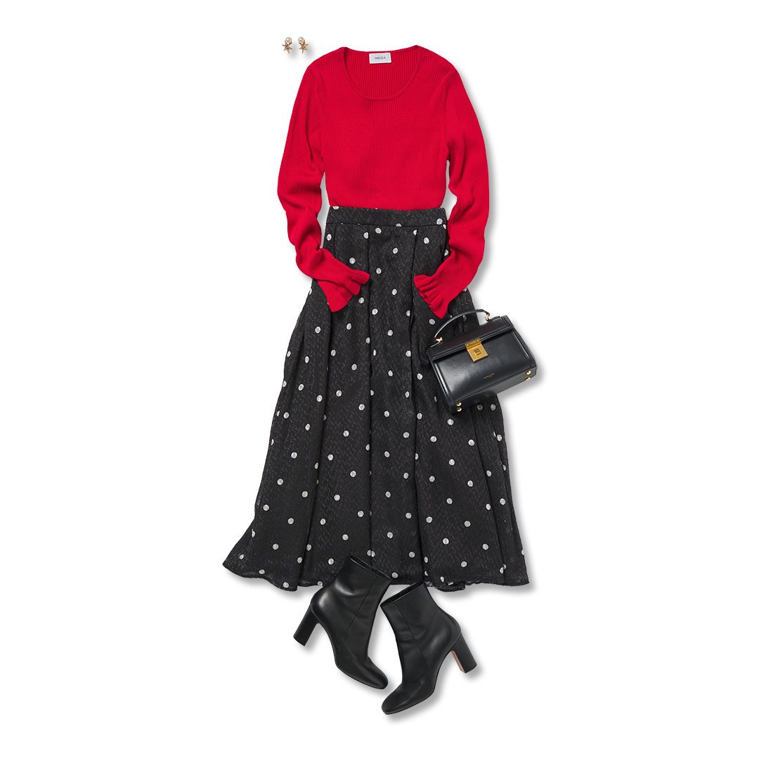 映画館デートなら、ほどよくカジュアルで気負わないおしゃれなコーディネートがおすすめ。今回は、トレンド感のあるチュールスカートに、ゆったりとしたシルエットのニットを合わせました。クリスマスカラーの赤ニットは、華やかさと季節感を演出できるので、クリスマスシーズンにぜひトライしていただきたい1着です。