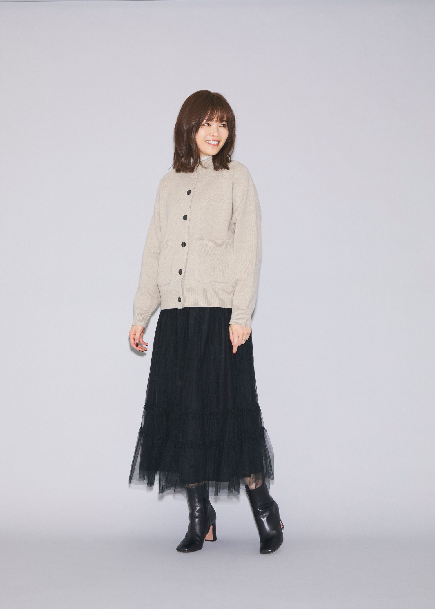 トップスは、やさしい印象のベージュのニットカーディガンを主役に。カジュアルすぎず気負わない、居心地の良いデートコーデに仕上がります。