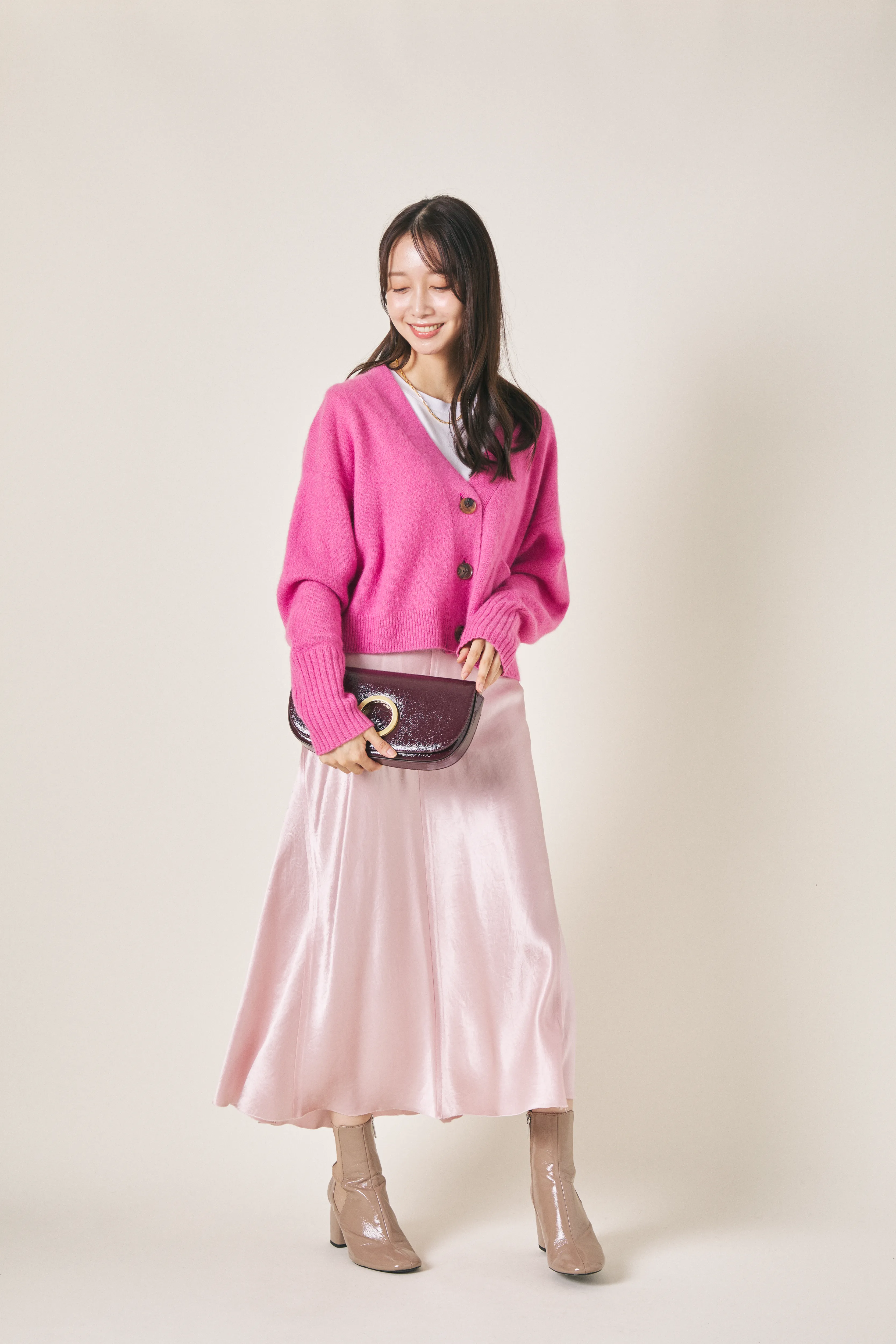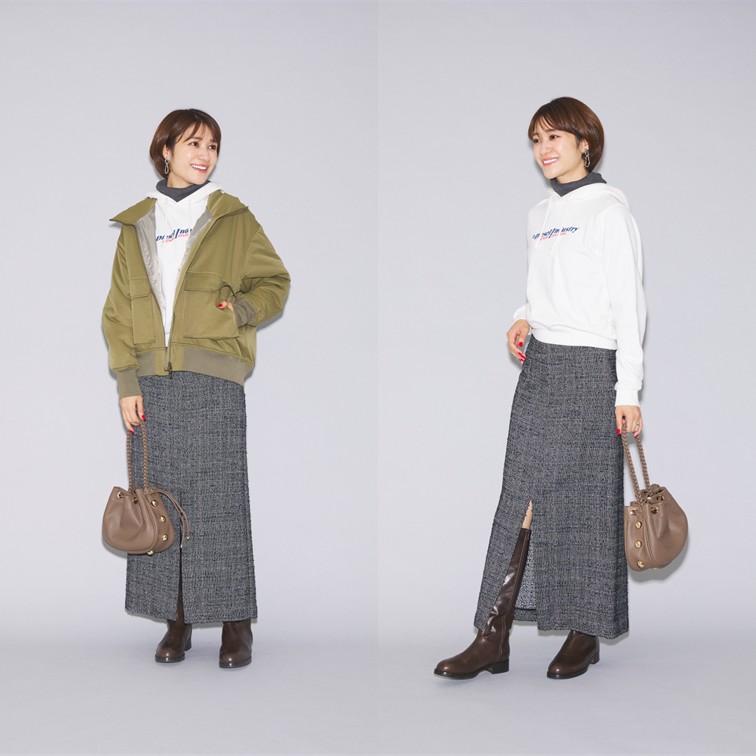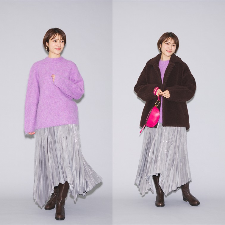 トップスには、あえてメンズのゆったりとしたニットを選び、リラックス感をプラス。スカートの光沢感とニットのボリューム感が絶妙なコントラストを生み出し、洗練されたバランスに仕上がります。アウターには、防寒性に優れたボア素材のコートをセレクト。落ち着いたブラウンの色味が全体を引き締めてくれます。