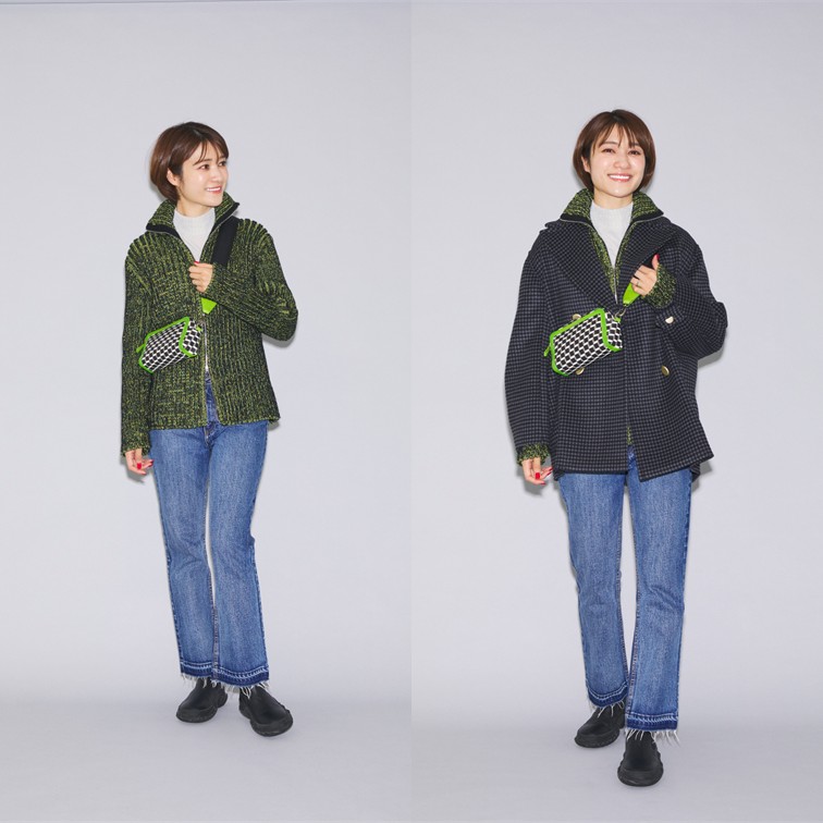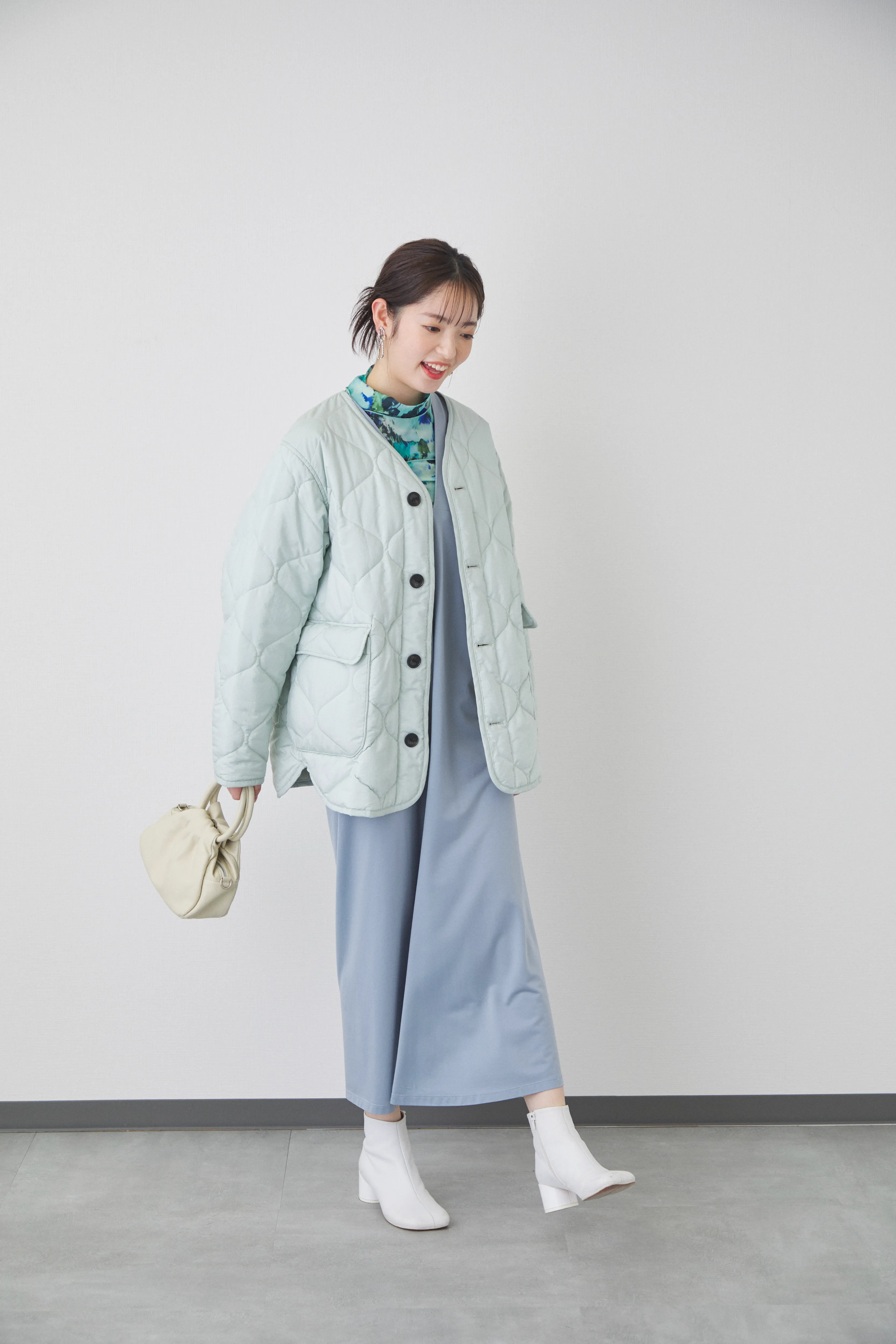 アウターには、ショートコートとキルティングベストを重ねたエズミ(EZUMi)のレイヤードコートをセレクト。襟元や裾からのぞくキルティングがさりげないアクセントになり、全体をぐっとおしゃれで親しみやすい印象に仕上げてくれます。