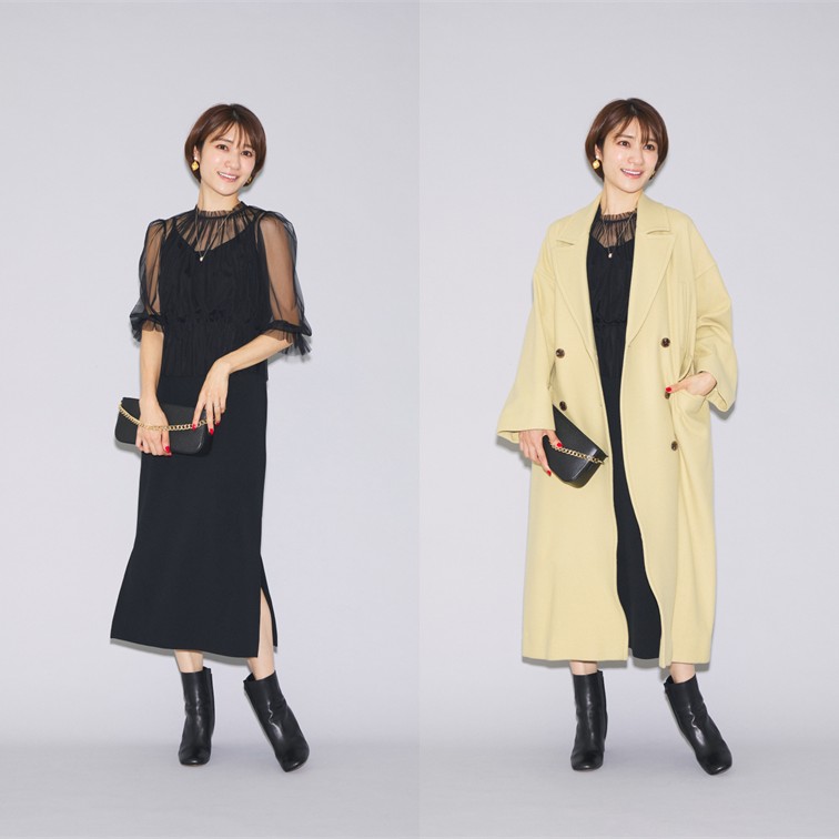 アウターには、柔らかなイエローカラーのコートをセレクト。明るい色味が全体を柔らかく仕上げつつ、シックなブラックドレスとのギャップがデートの特別感を引き立てます。仕上げには、ゴールドのチェーンが煌めくクラッチバッグをプラスして、エレガントさをさらにアップ。