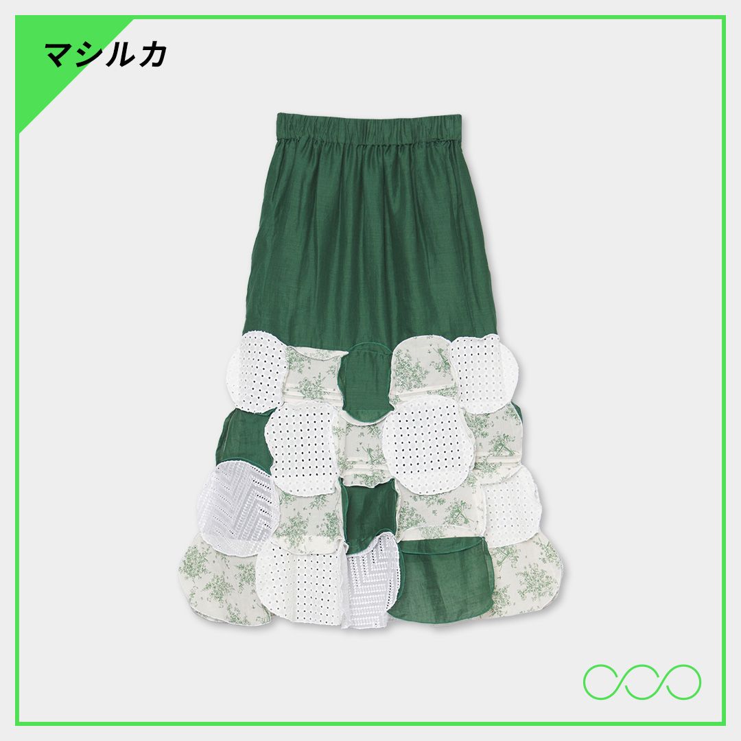 もとになった洋服の素敵なディテールや素材を活かしつつ、丸や四角の形を用いた作品づくりが特徴のマシルカ。今回は、遊び心溢れるフォレストグリーンのスカートをピックアップしてご紹介します。